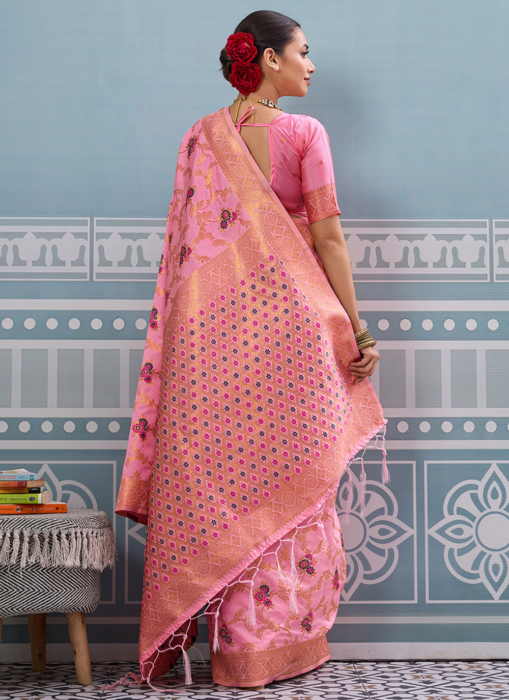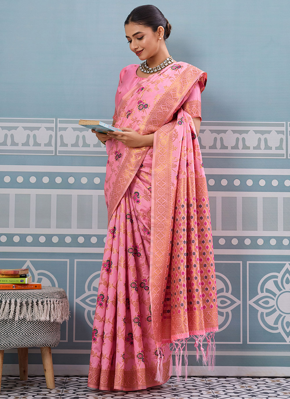 Crafted from premium silk, this designer pink saree showcases rich zari weaving all over. The smooth texture and shimmering detailing create a graceful look that suits both traditional and modern occasions. Comes with matching blouse.