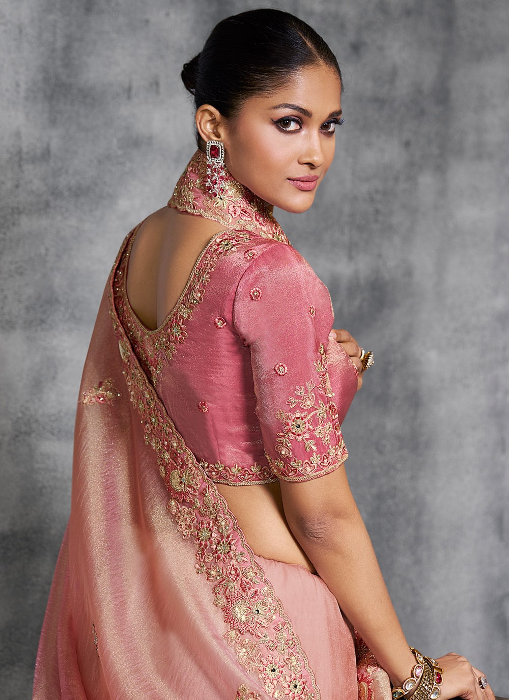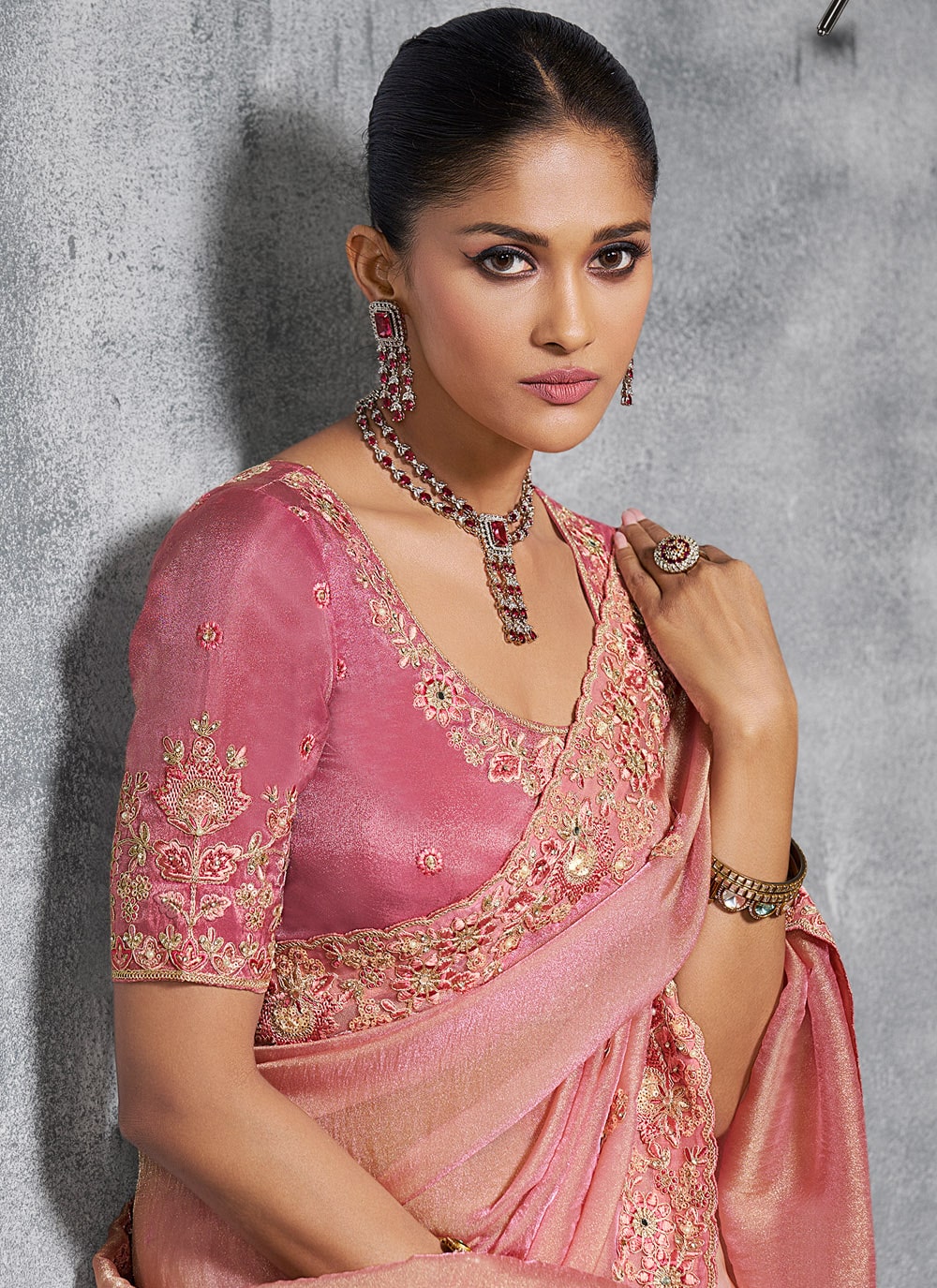 This embroidered pink tissue saree features resham thread artistry and refined stone detailing. Its lightweight drape and elegant finish make it a memorable choice for engagement ceremonies and festive evenings. Comes with matching blouse.