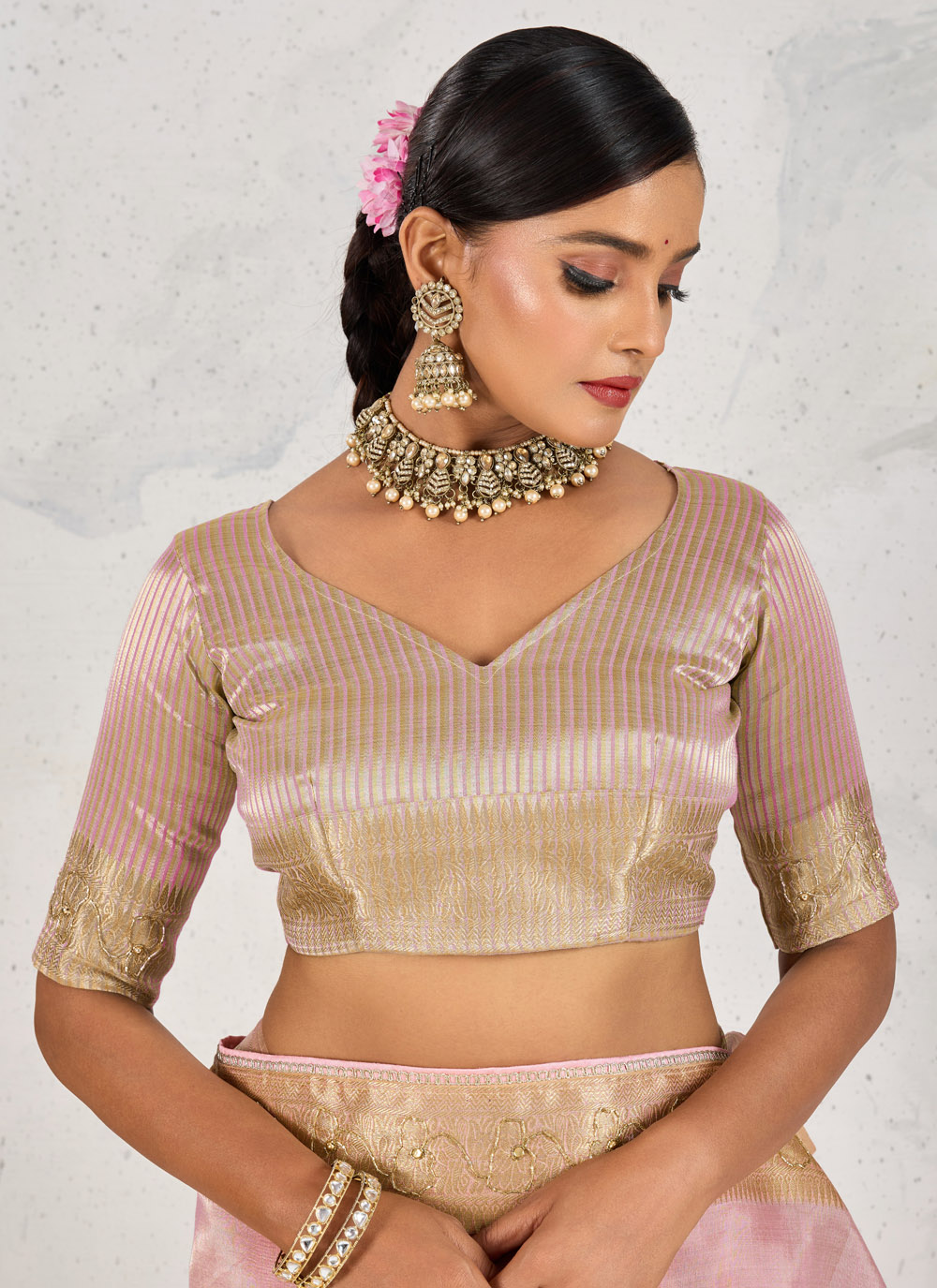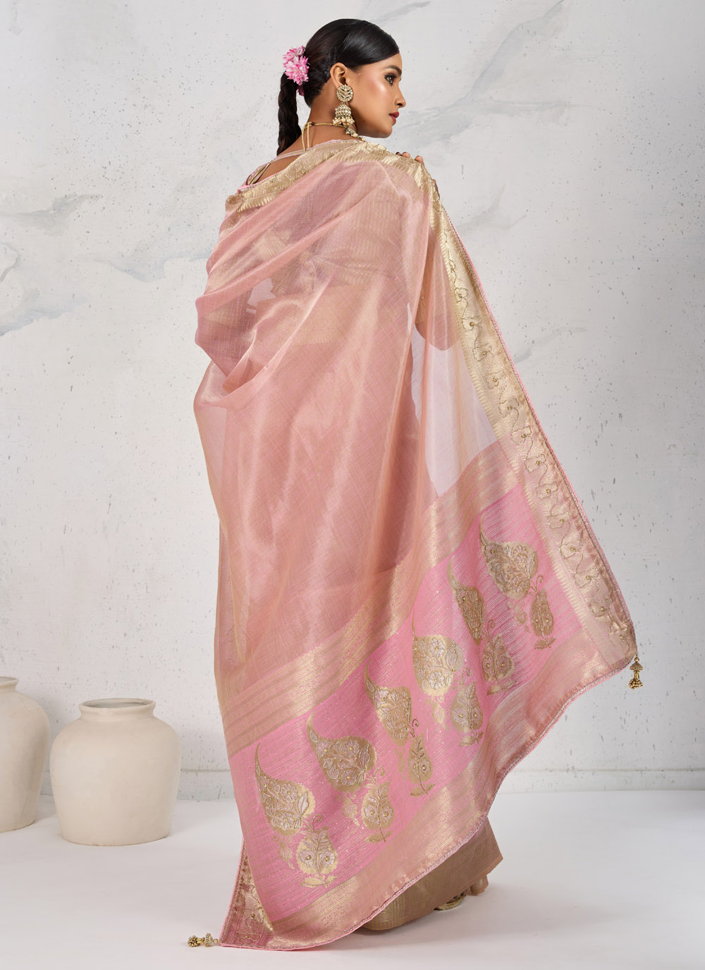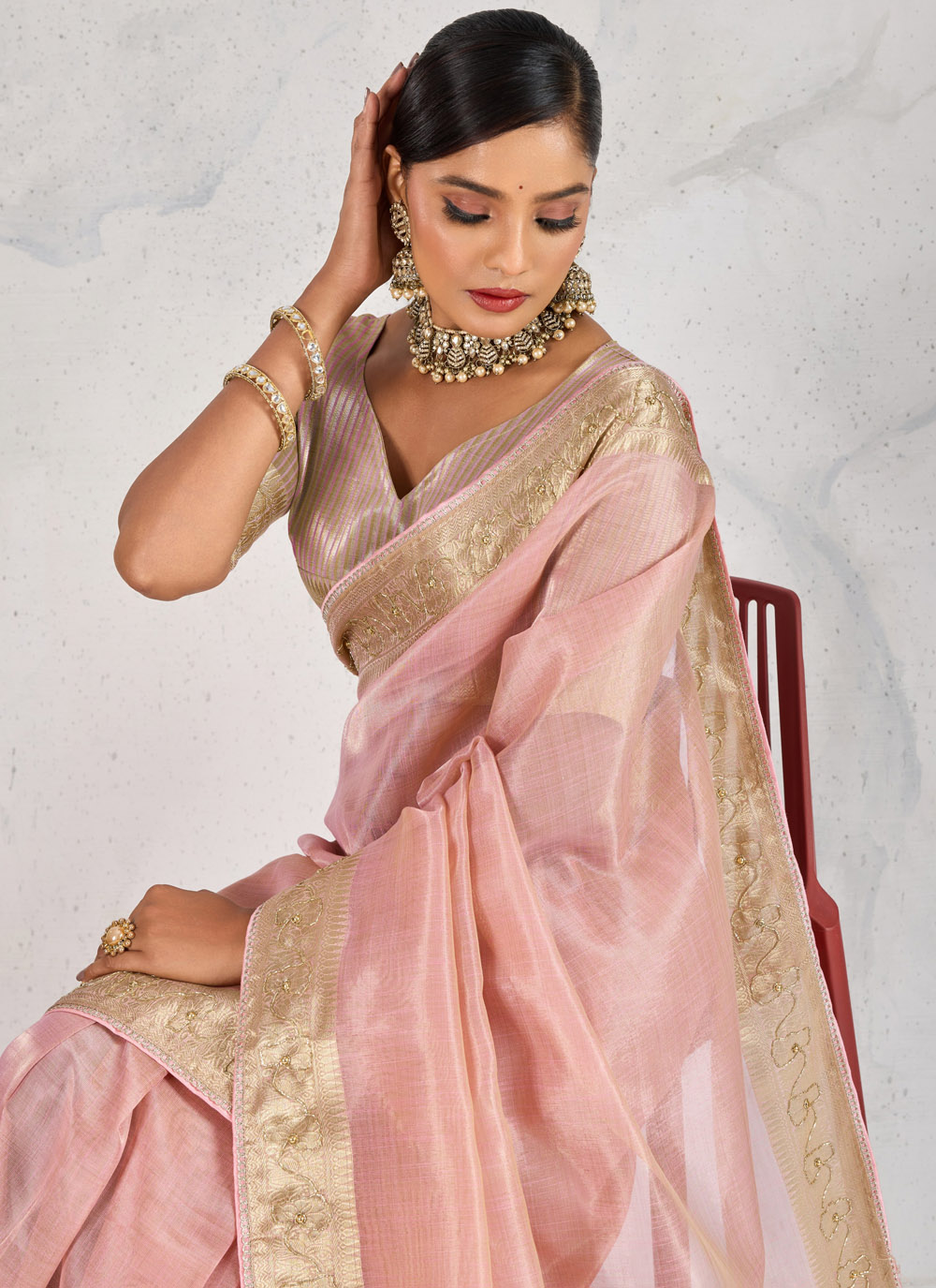 This Pink Tissue Linen Saree is a work of art, showcasing graceful Zardosi embroidery, dazzling Cutdana detailing, luxurious pearl embellishments, and elegant thread work. A statement piece for weddings, receptions or grand festivities. Comes with matching blouse.