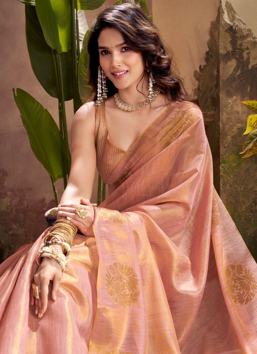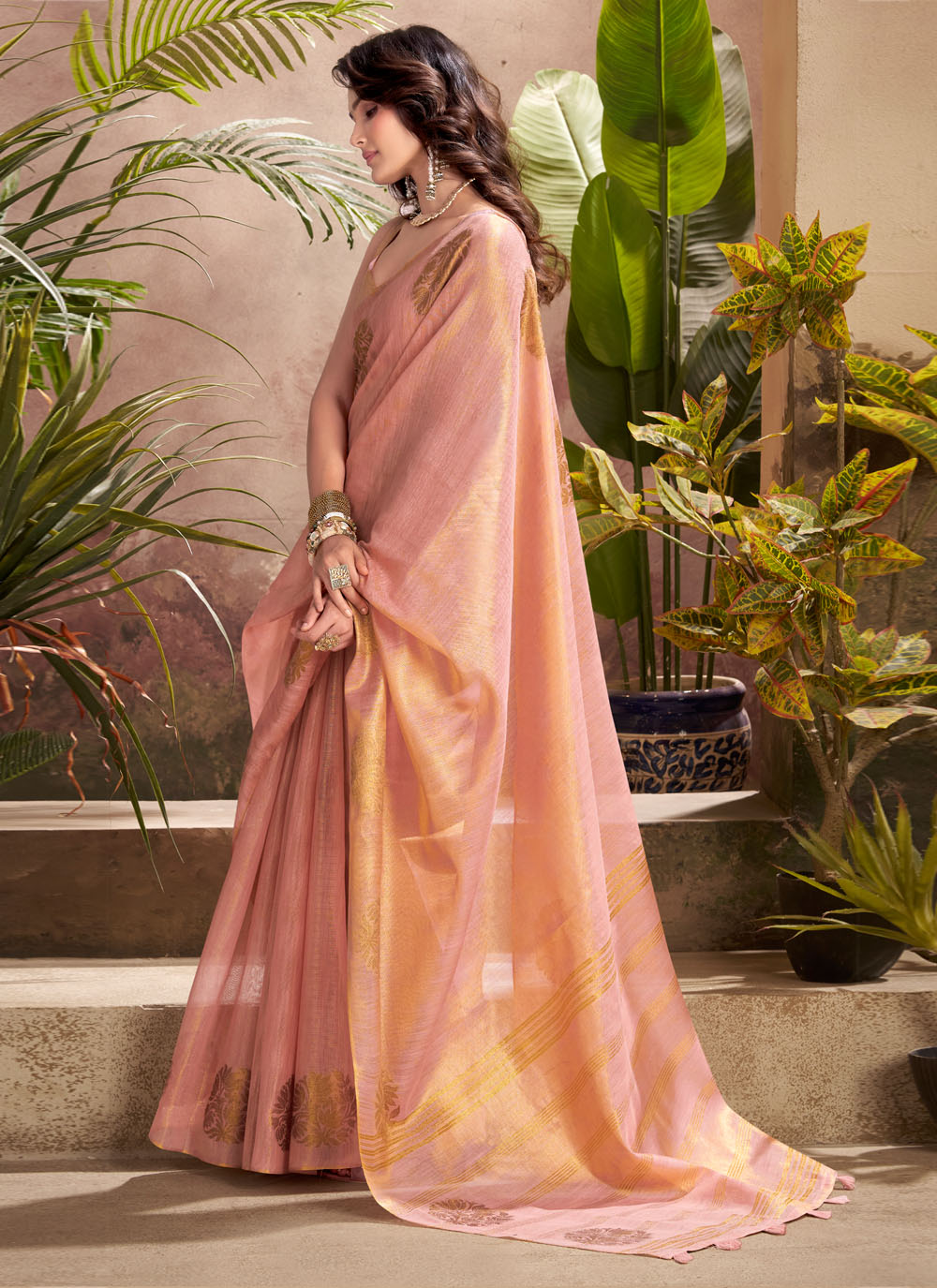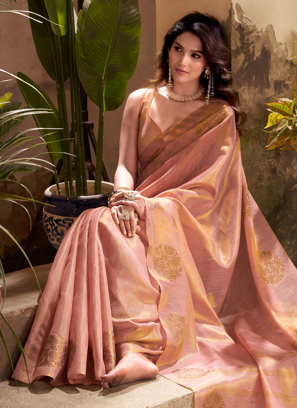This Pink Tissue Silk Contemporary Saree captures the essence of modern elegance with a nod to cultural heritage. The fine woven work creates a graceful sheen that catches the light beautifully, while the pastel pink hue exudes sophistication. Comes with matching blouse.