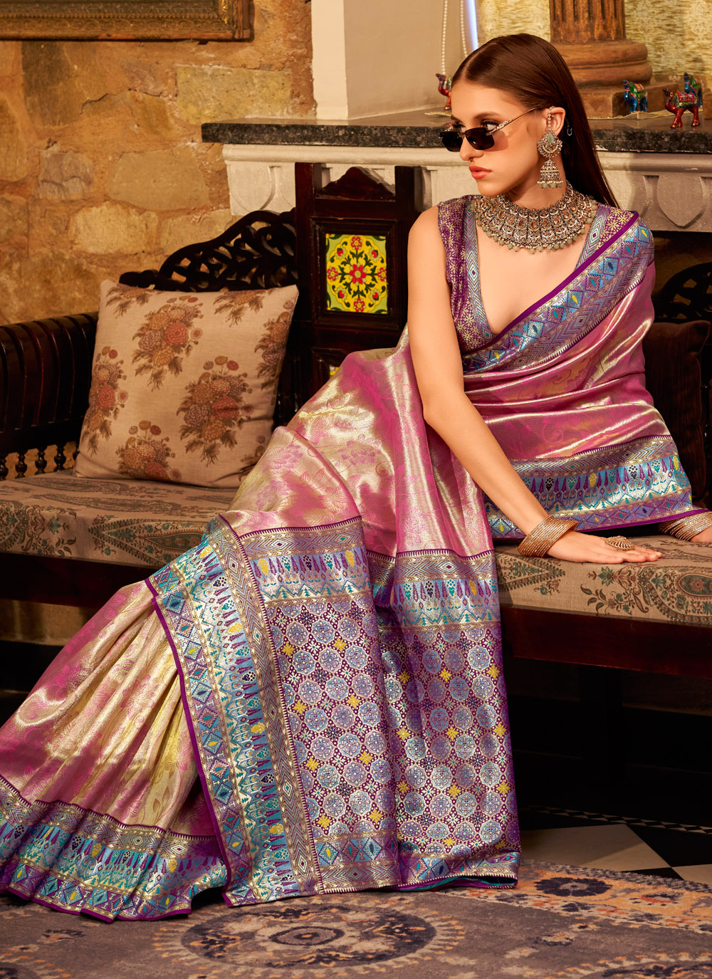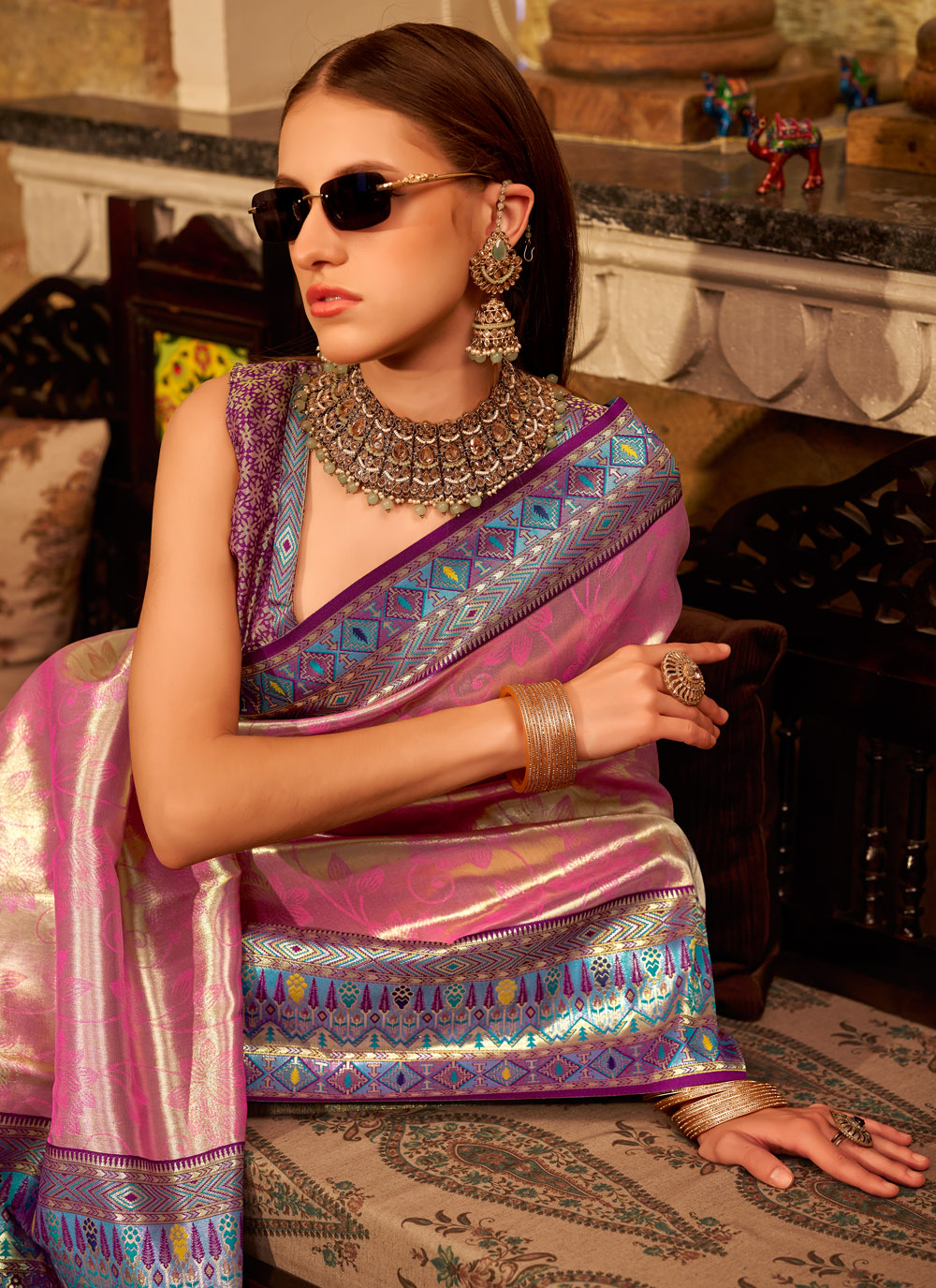 Elevate your ethnic wardrobe with this striking pink designer saree, woven in premium tissue silk and accentuated by refined weaving work. Perfect for those who prefer modern silhouettes with a traditional flair. Comes with matching blouse.