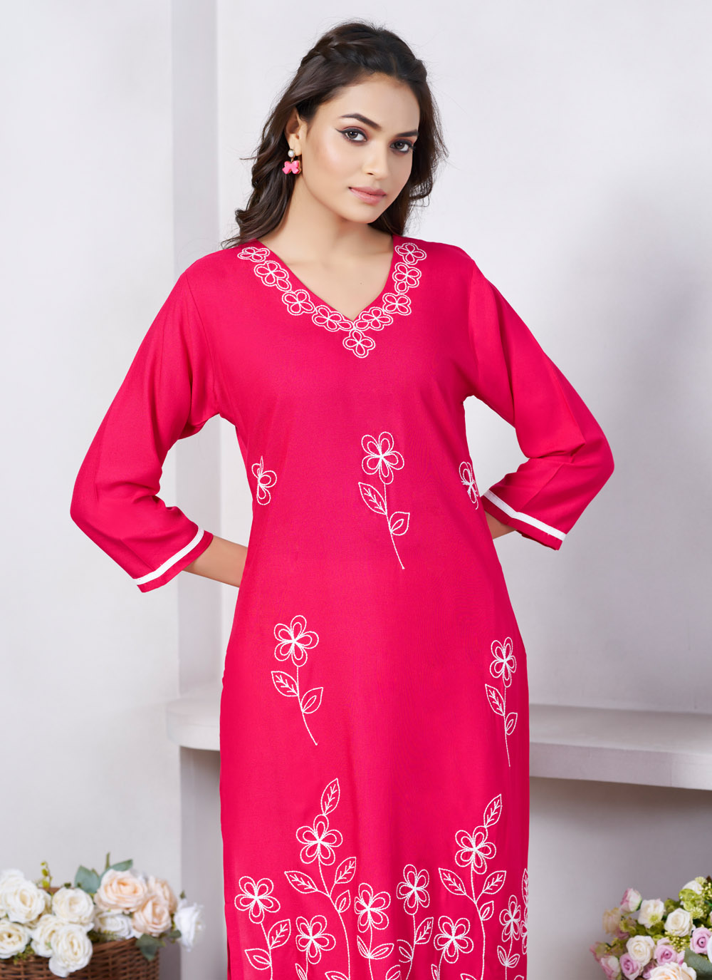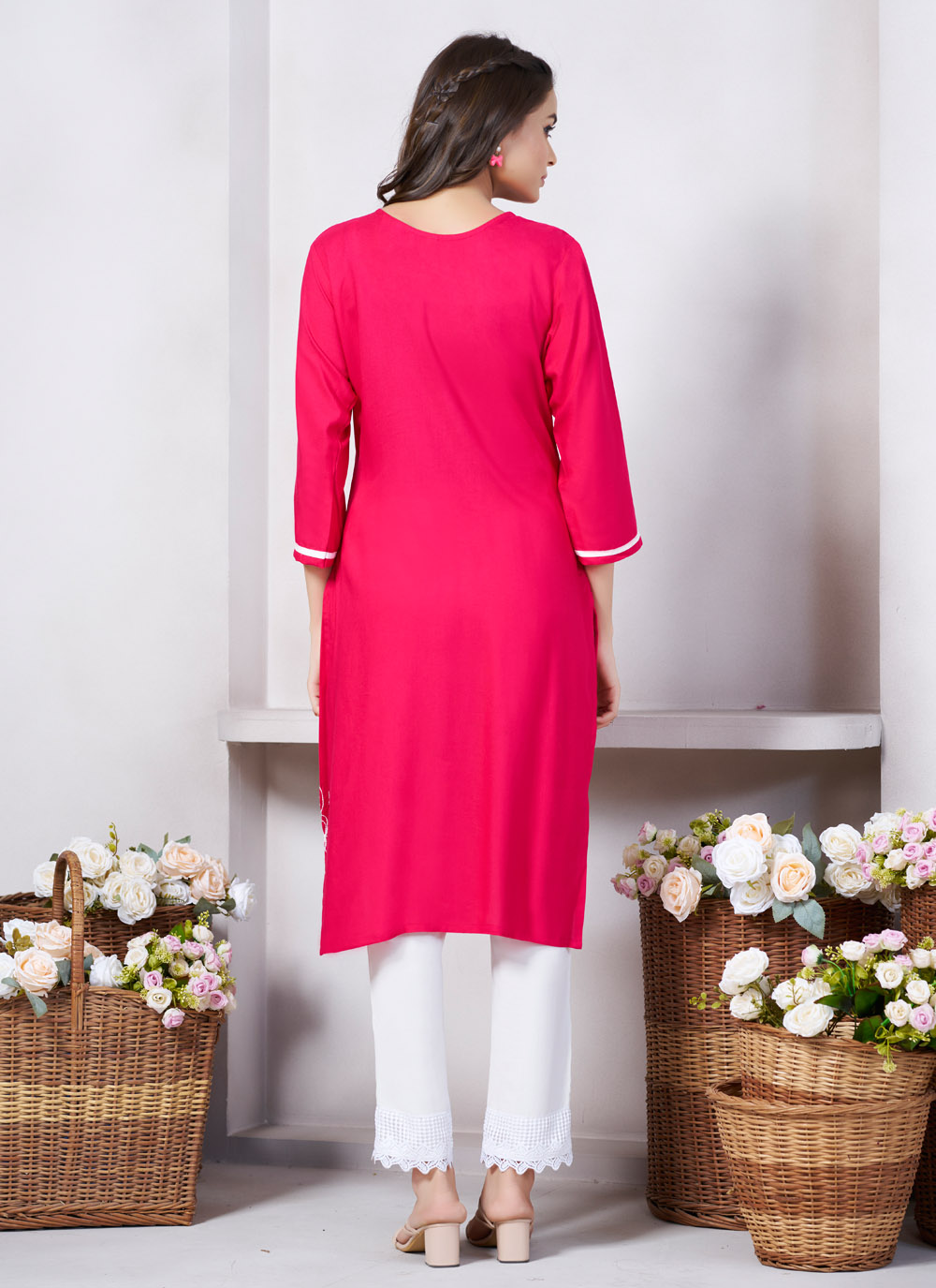 Add a soft touch of elegance to your everyday look with this Pink Viscose Rayon Kurti. Featuring graceful embroidery work and a flowy silhouette, this kurti offers all-day comfort with a stylish twist.