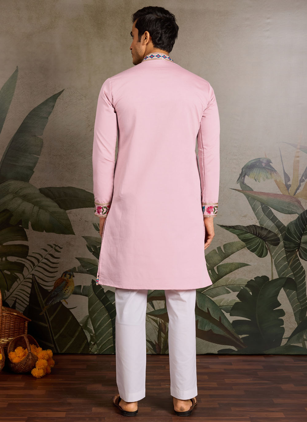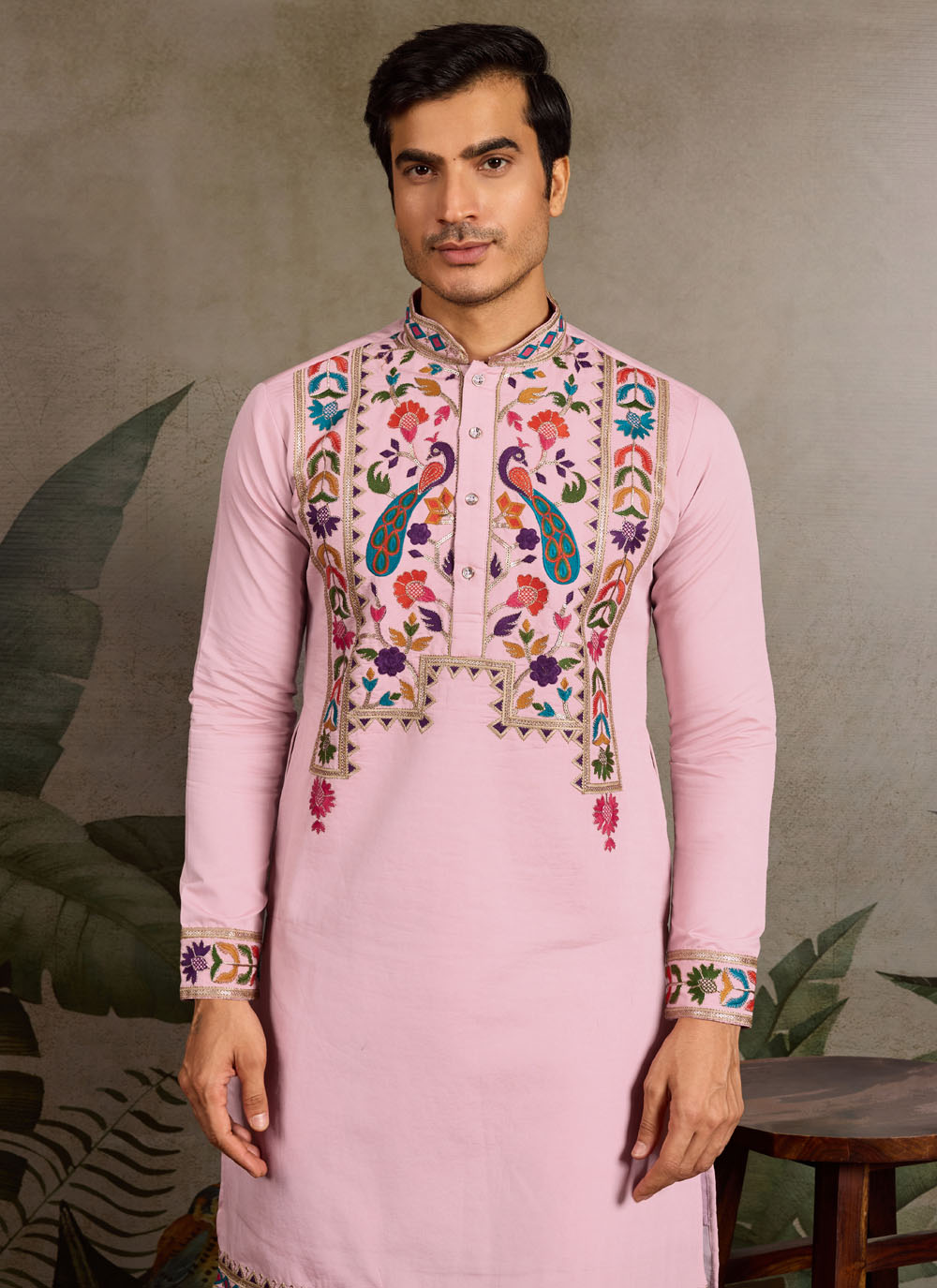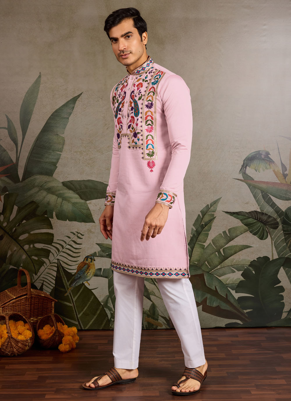 Grace your ceremonial look with this Pink Viscose Silk Kurta, crafted with intricate embroidery that adds elegance and sophistication. The soft sheen of silk and the vibrant pink tone make it perfect.