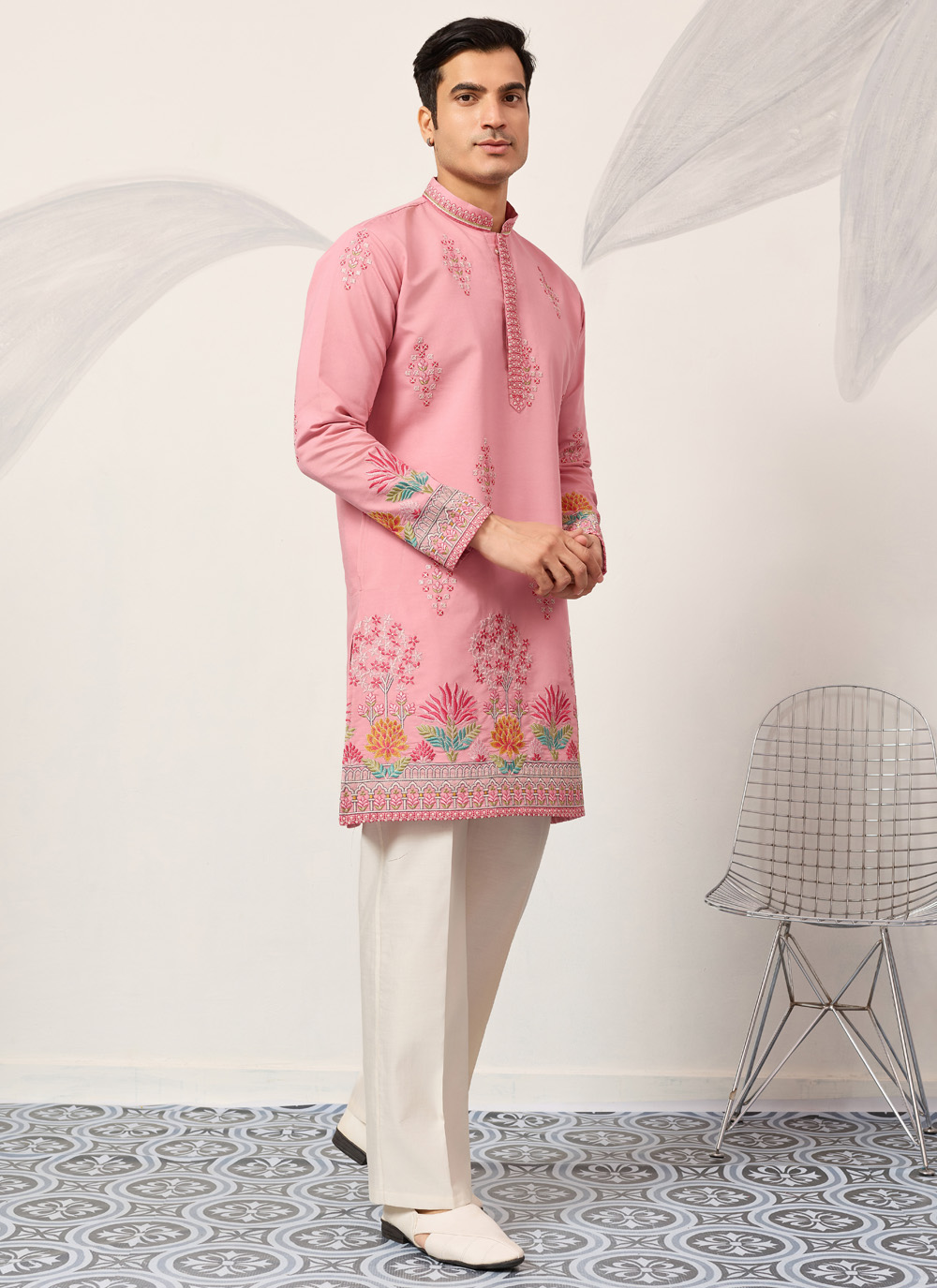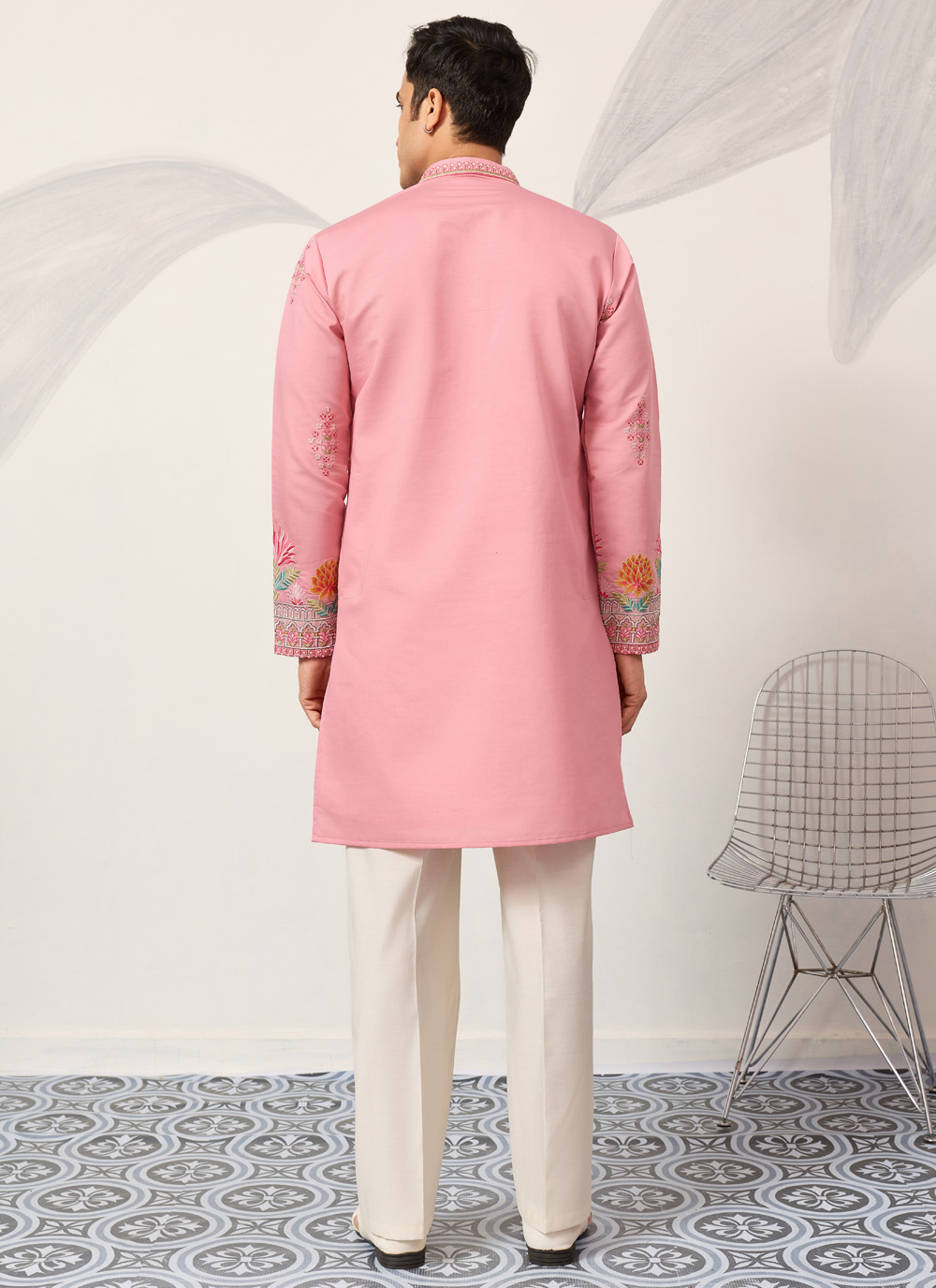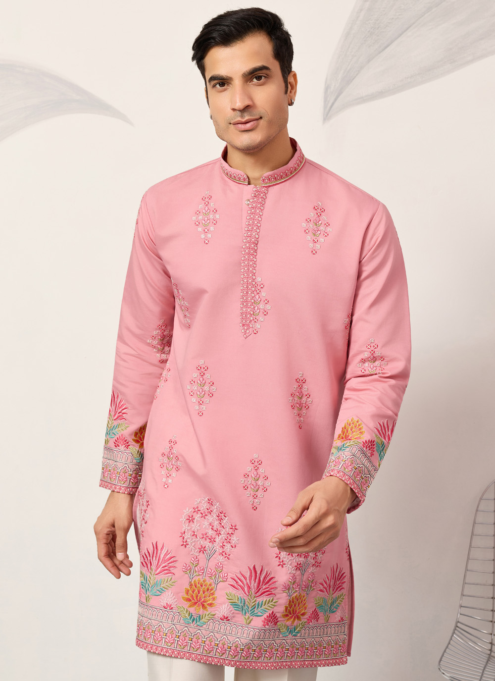 This pink viscose silk embroidered kurta blends comfort with timeless style. Shop this kurta featuring detailed thread work that enhances its traditional charm. A perfect kurta to buy for family functions, festive gatherings, and cultural occasions.