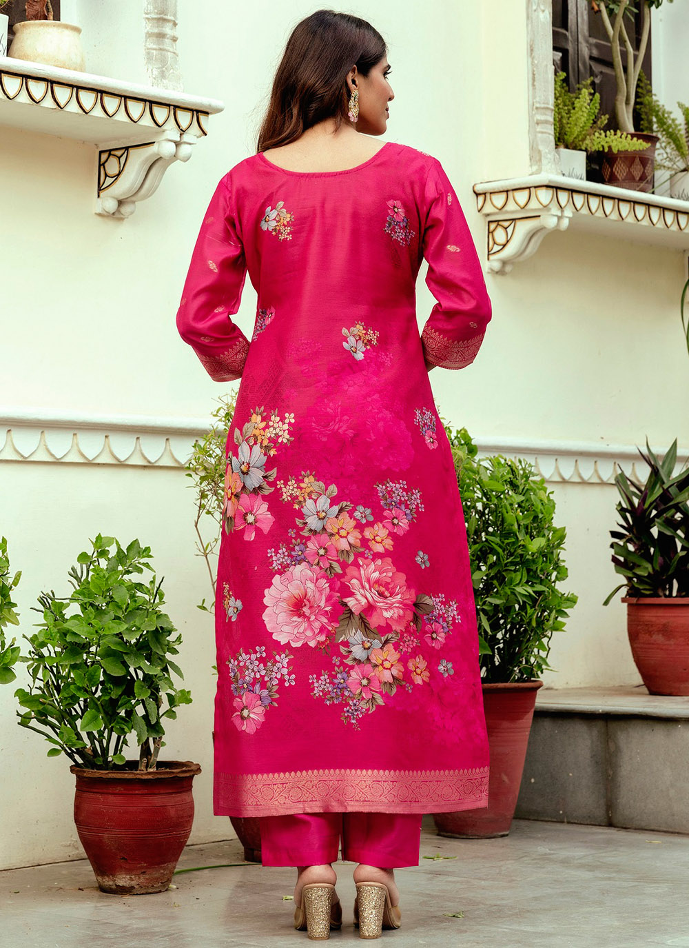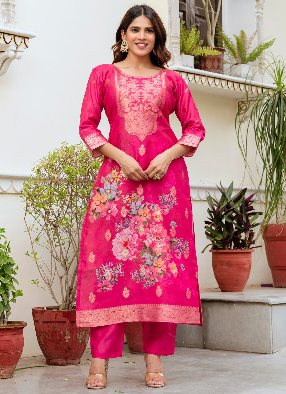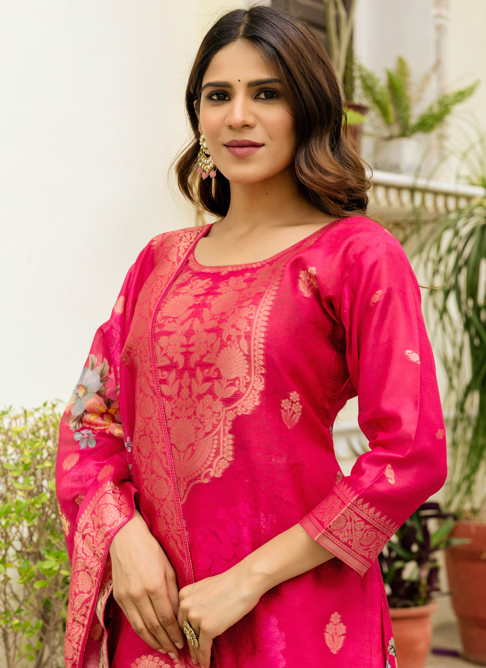Refresh your ethnic collection with this Trendy Pink Chanderi Cotton Salwar Suit, designed to offer both comfort and sophistication. The woven fabric adds richness, while the printed design keeps the look light and modern. Comes with matching bottom and dupatta.
