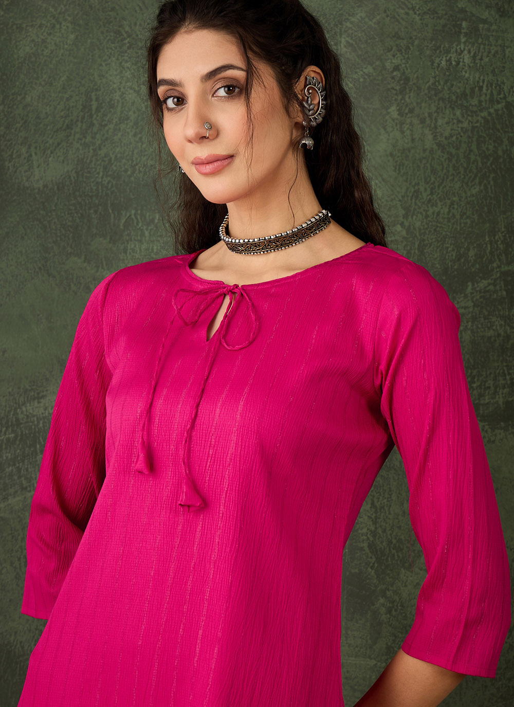 This designer pink cotton silk blend kurti reflects sophistication and modern ethnic style. The premium fabric offers durability and comfort, while the woven work creates a rich and elegant appearance.