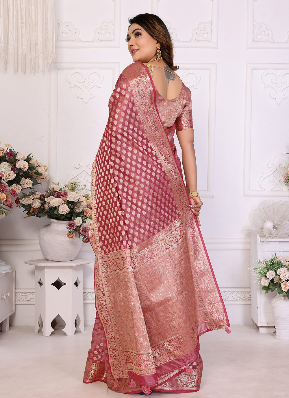 The Pink Woven Zari Border Classic Saree features a beautiful pink hue with intricate zari work along the border, adding a touch of elegance and tradition. Paired with a matching blouse, this saree is perfect for festive or special occasions, offering a timeless, graceful look.