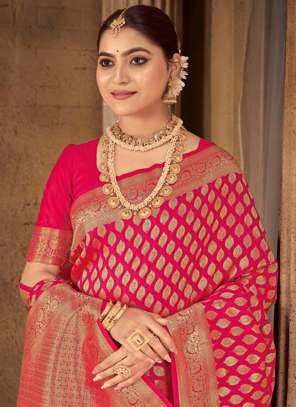 Make a graceful fashion statement with this Pink Banarasi Silk Trendy Saree, featuring premium zari weaving work. The vibrant color and elegant design create a refined and stylish look. Comes with matching blouse.