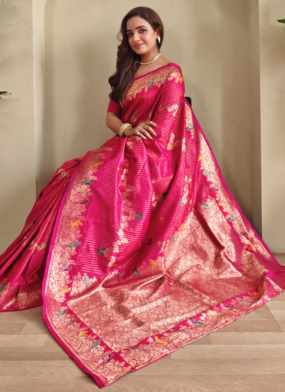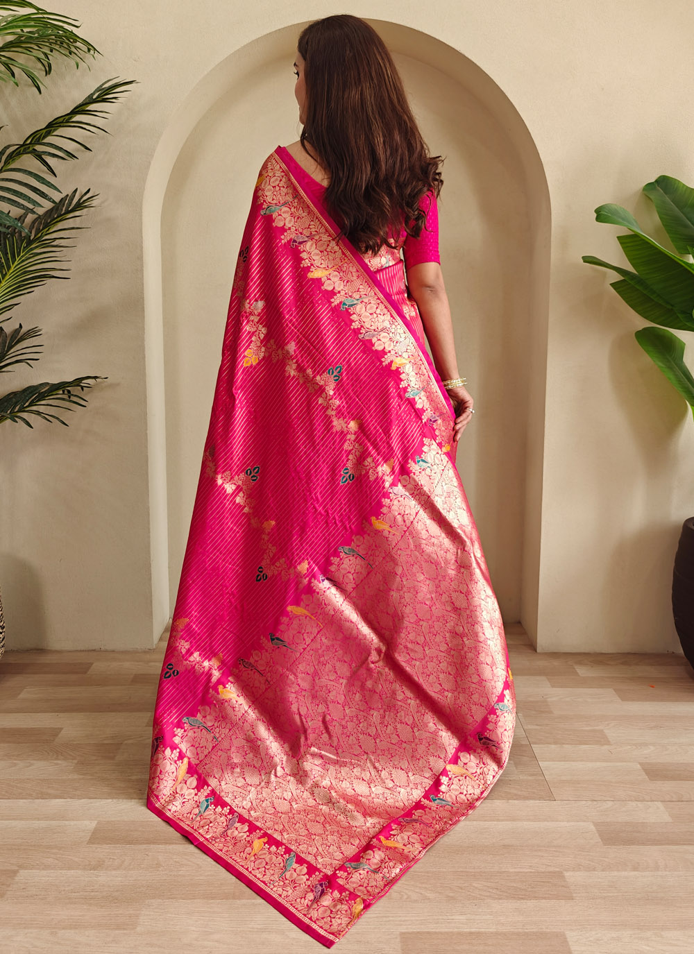 Step into elegance with this ceremonial Banarasi saree in rich pink, woven with golden zari motifs over smooth satin silk. A timeless masterpiece blending heritage art with graceful aesthetics. Comes with matching blouse.