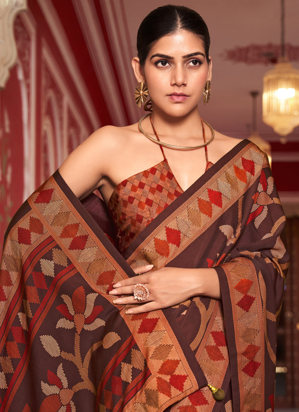 This traditional brown silk saree features beautiful prints that highlight its earthy tone. The lightweight fabric flows easily, making it comfortable for long hours while maintaining a dignified ethnic look. Comes with matching blouse.