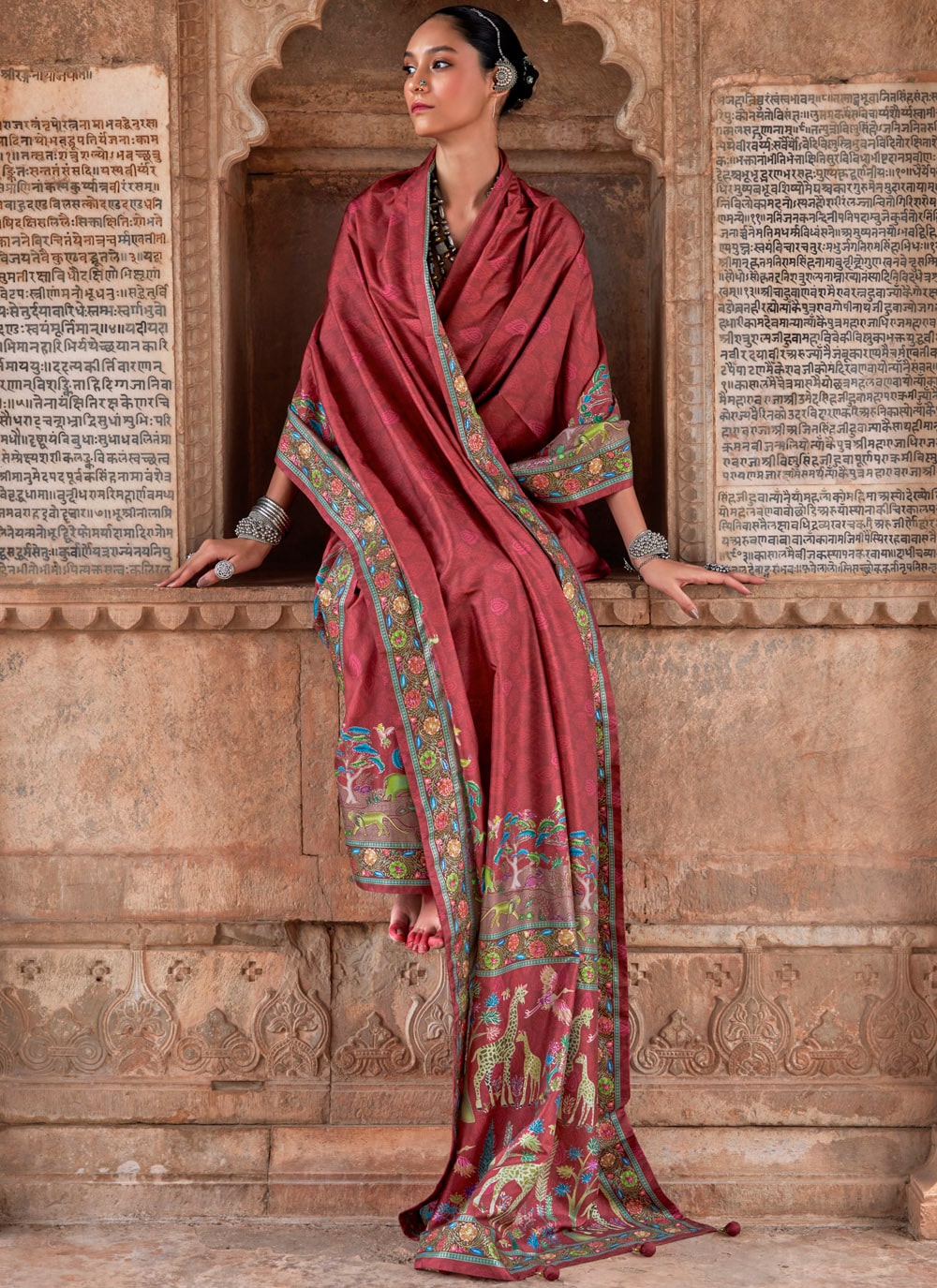 Step into timeless beauty with this rust silk saree, decorated with elegant print work that highlights its classic appeal. The warm rust tone gives it a regal charm, while the soft silk drapes with ease, making it perfect for festive occasions, cultural functions and family gatherings. Comes with matching blouse.