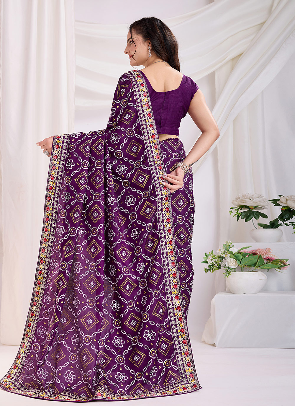 This Printed Embroidered Work Vichitra Silk Saree in purple combines intricate embroidery with vibrant prints for a stunning look. It comes with a matching blouse, making it an ideal choice for any special occasion.