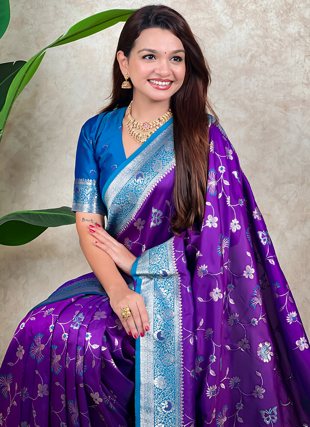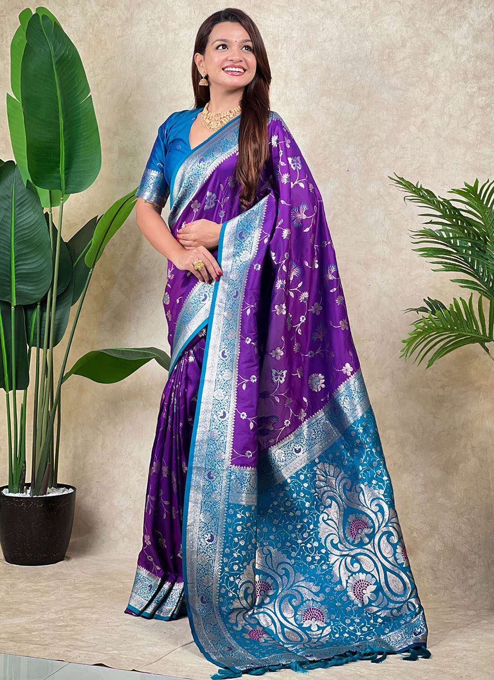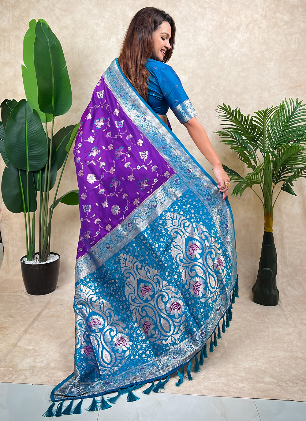 Enhance your ethnic wardrobe with this designer purple Banarasi silk saree showcasing classic meenakari patterns and traditional zari weaving. The blend of heritage craftsmanship and premium silk. Comes with matching blouse.