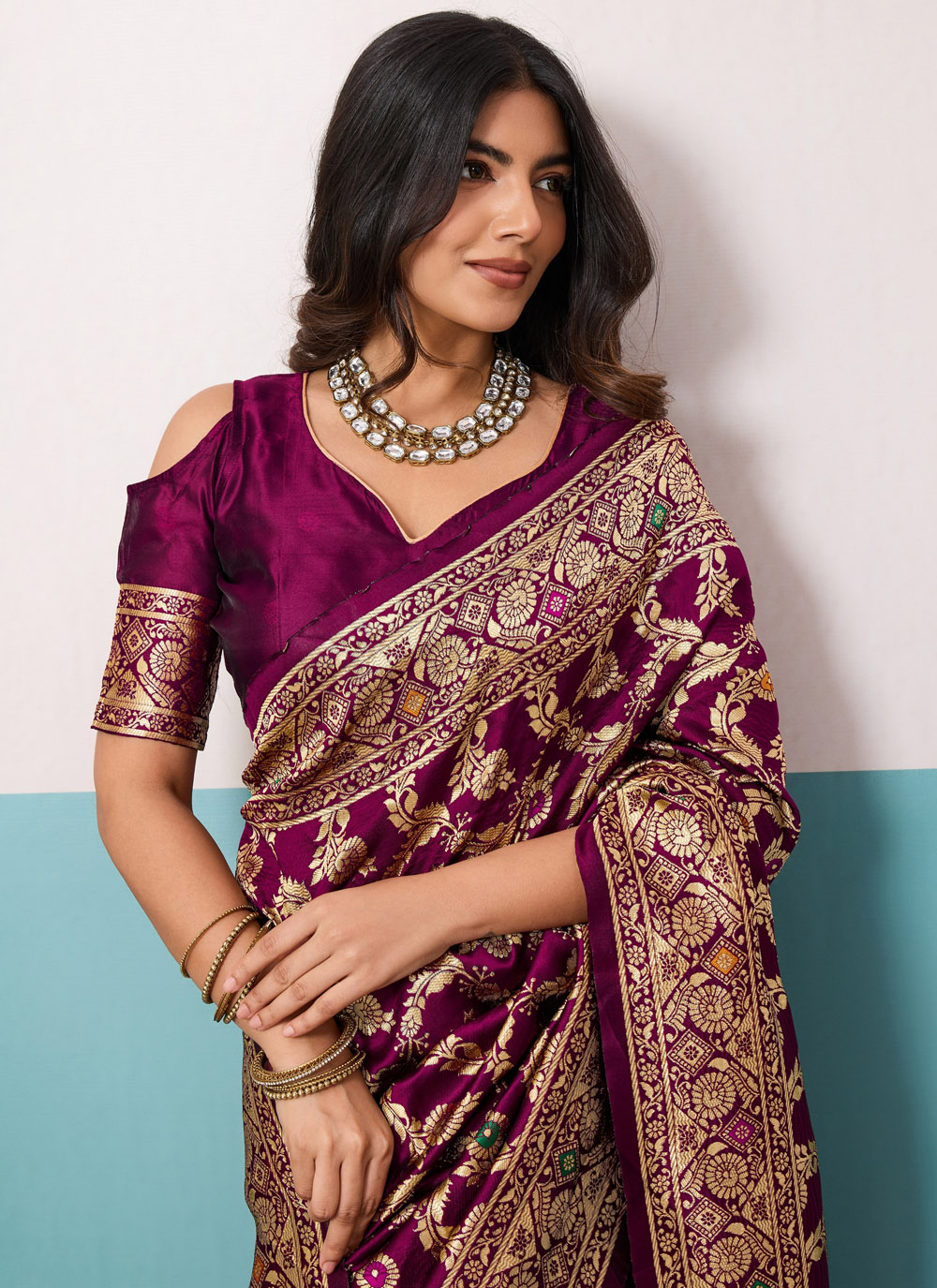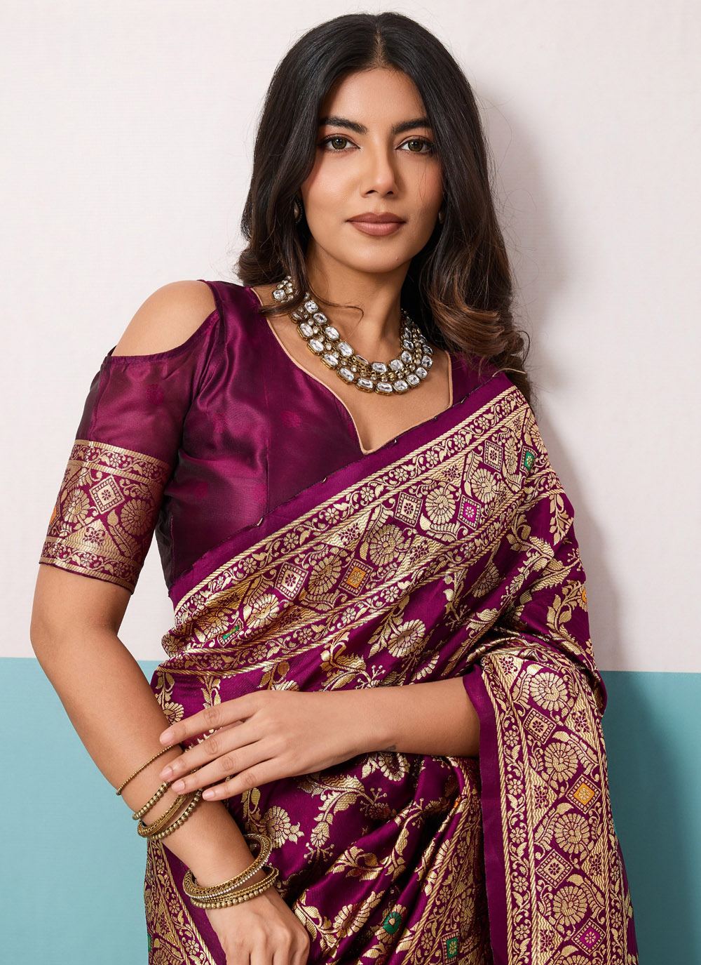The Purple Banarasi Silk Woven Contemporary Saree represents modern ethnic fashion with a touch of traditional craftsmanship. The intricate woven detailing combined with luxurious silk fabric creates a graceful and elegant saree. Comes with matching blouse.