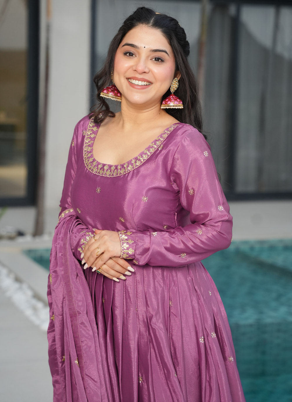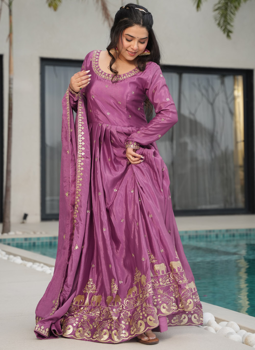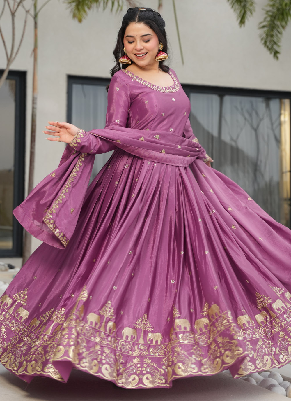 Crafted from premium Chinon fabric, this readymade gown is adorned with shimmering sequins and traditional zari work. Its complementary dupatta completes the festive look with finesse. Ideal for weddings, sangeet, or festivals, the outfit ensures both comfort and couture appeal.