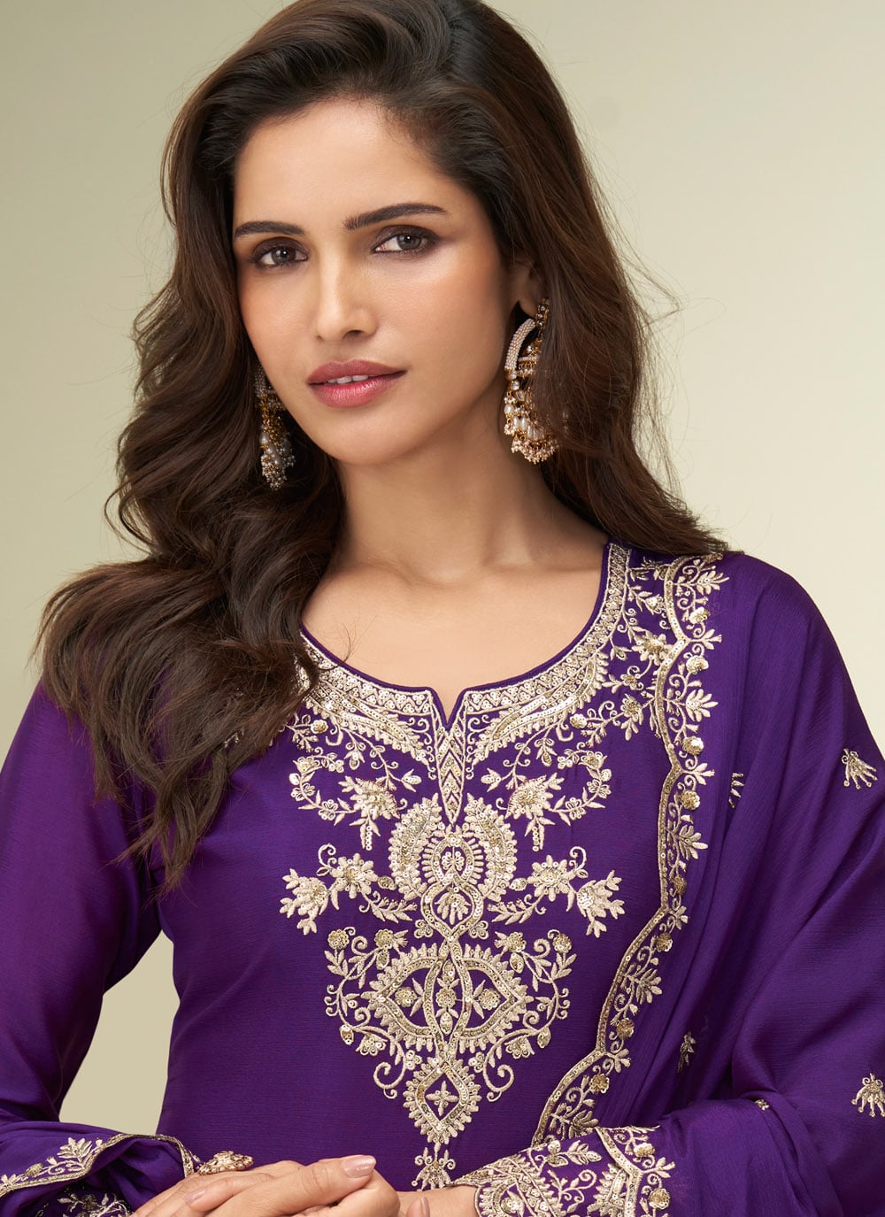 Grace your special occasions in this stunning Purple Chinon zari embroidered suit. Ready to wear and designed for comfort, it blends rich traditional embroidery with a contemporary touch, giving you a regal and effortless look. Comes with matching bottom and dupatta.