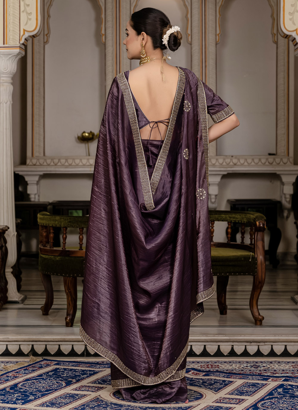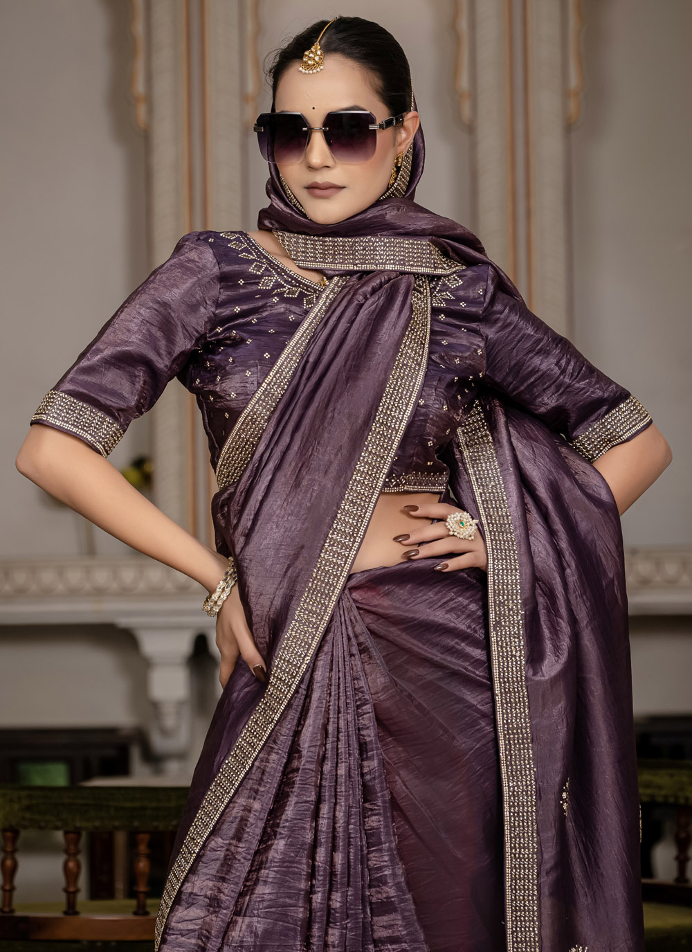 This purple saree effortlessly blends heritage artistry with modern fashion. The crushed fabric flows beautifully, while detailed zarkan and cut dana embroidery adds glamour and sophistication for upscale events. Comes with matching blouse.