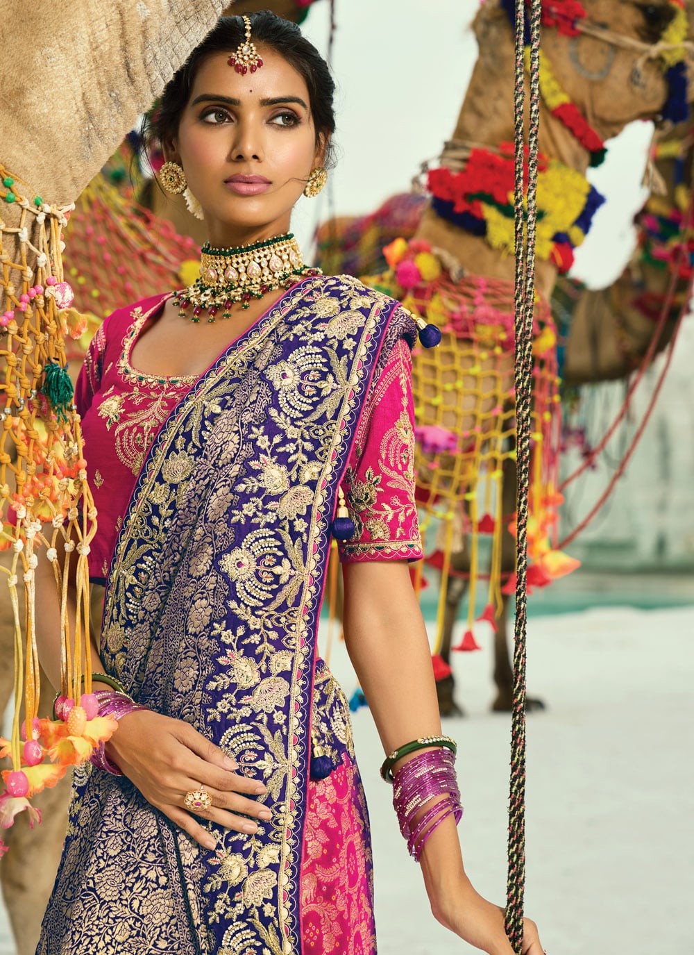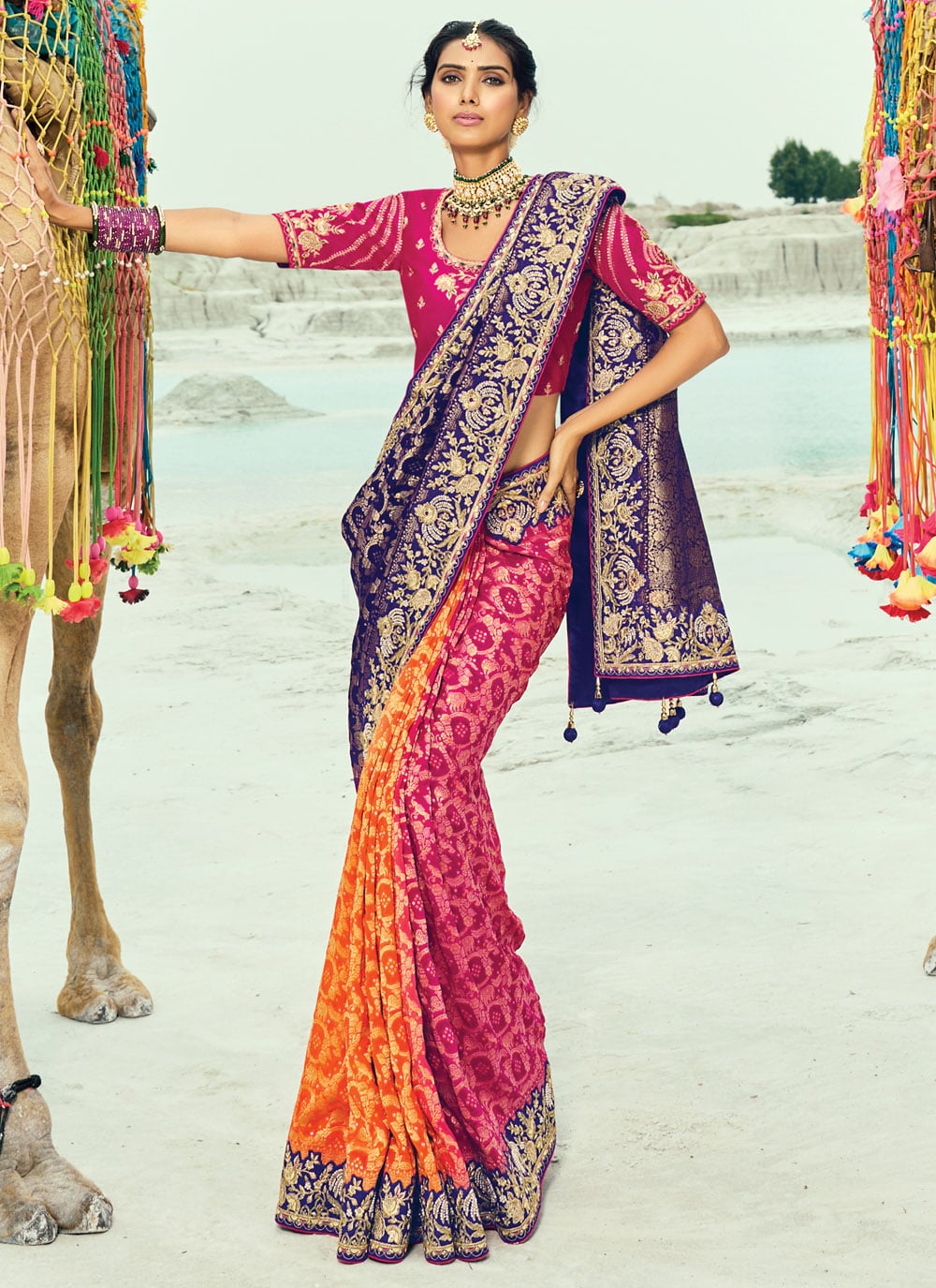 Add a royal charm to your wardrobe with this pure georgette Bandhej saree in purple. The intricate zari handwork paired with cutdana and bead detailing makes it a stunning classic piece for timeless elegance. Comes with matching blouse.