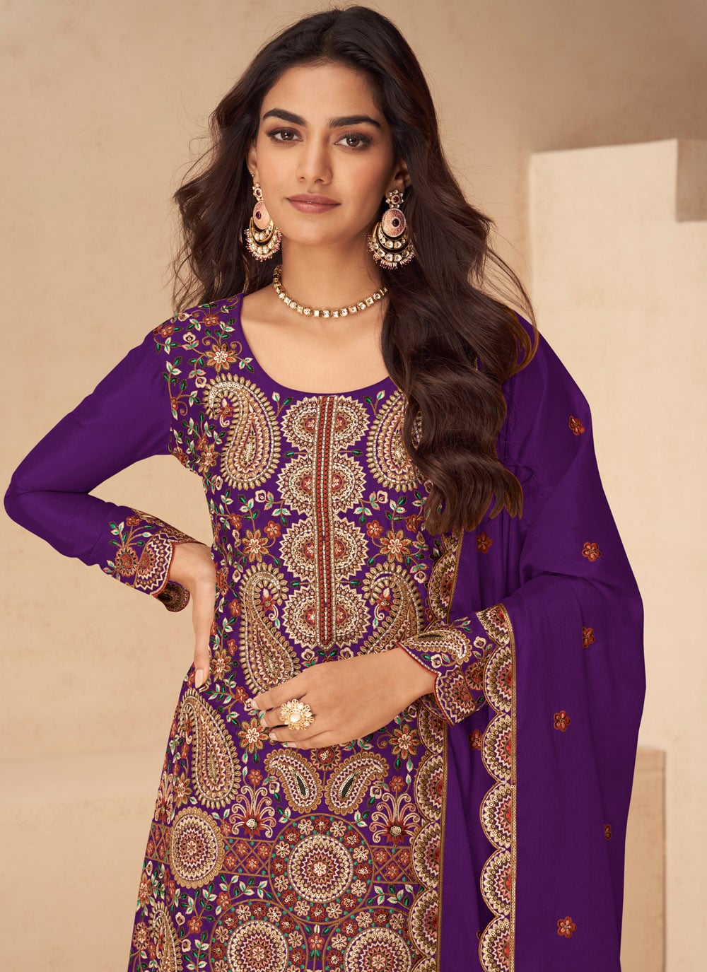 Crafted in soft Chinon fabric, this embroidered purple palazzo style suit brings together ease and elegance. Its flowing silhouette and detailed embroidery work make it a fashionable choice for weddings or receptions. Comes with matching bottom and dupatta.