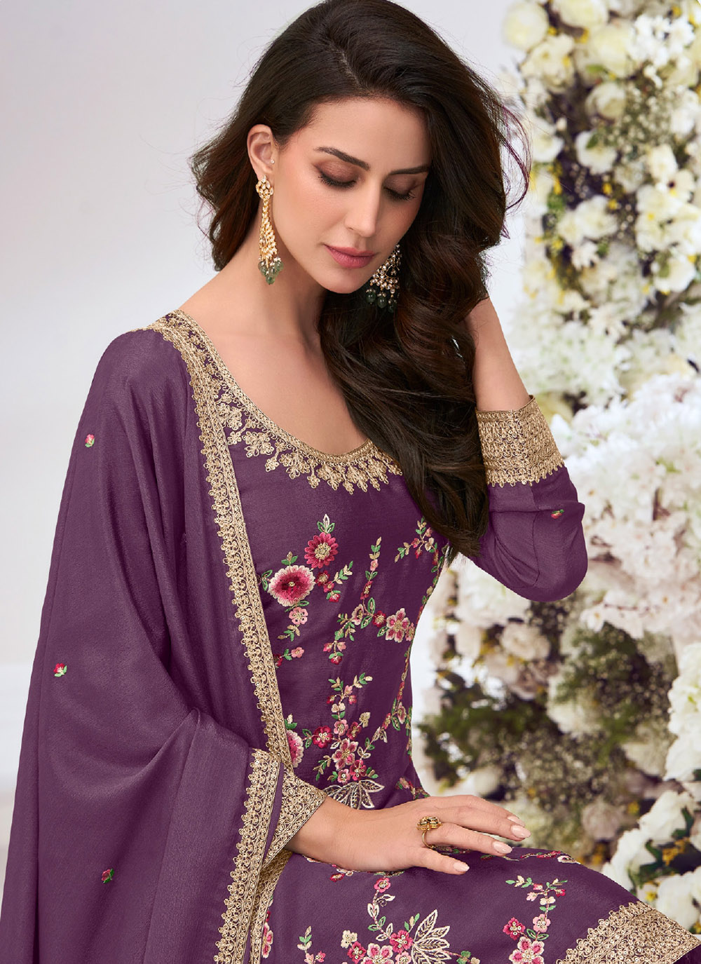 Step into ceremonial charm with this Purple Chinon Salwar Kameez, adorned with exquisite embroidery. The smooth chinon fabric offers a graceful drape, while the intricate work adds a regal touch. Comes with matching bottom and dupatta.