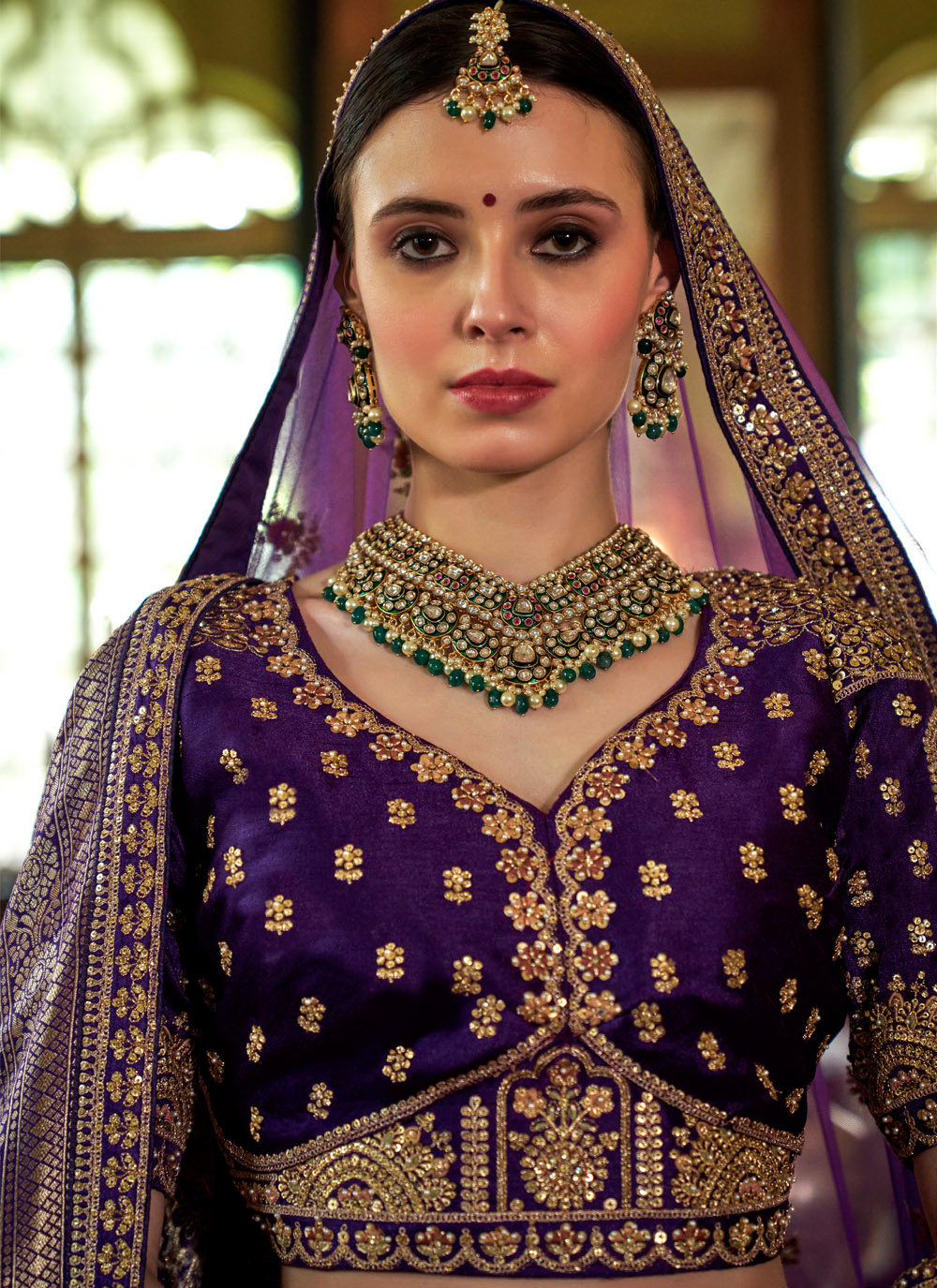 This purple embroidered lehenga choli is a true masterpiece that blends traditional zari artistry with the glamour of pearls and sequins. The silk base gives it a rich sheen, while the intricate embellishments add a celebratory sparkle. Comes with matching choli and dupatta.