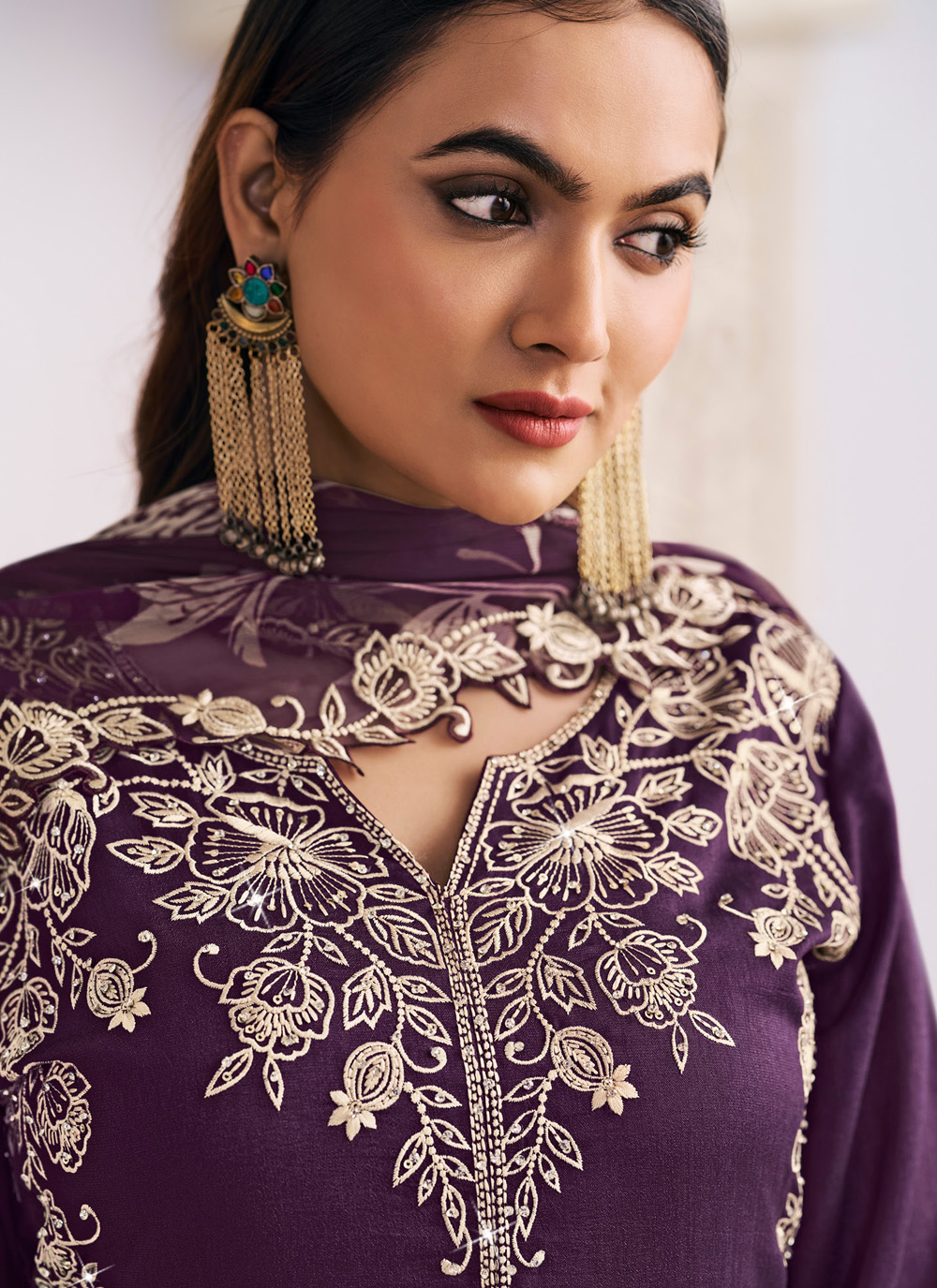 This purple embroidered silk palazzo set blends traditional craftsmanship with modern design. The detailed embroidery adds a regal touch, making it perfect for cultural events and ceremonial occasions. Comes with matching bottom and dupatta.