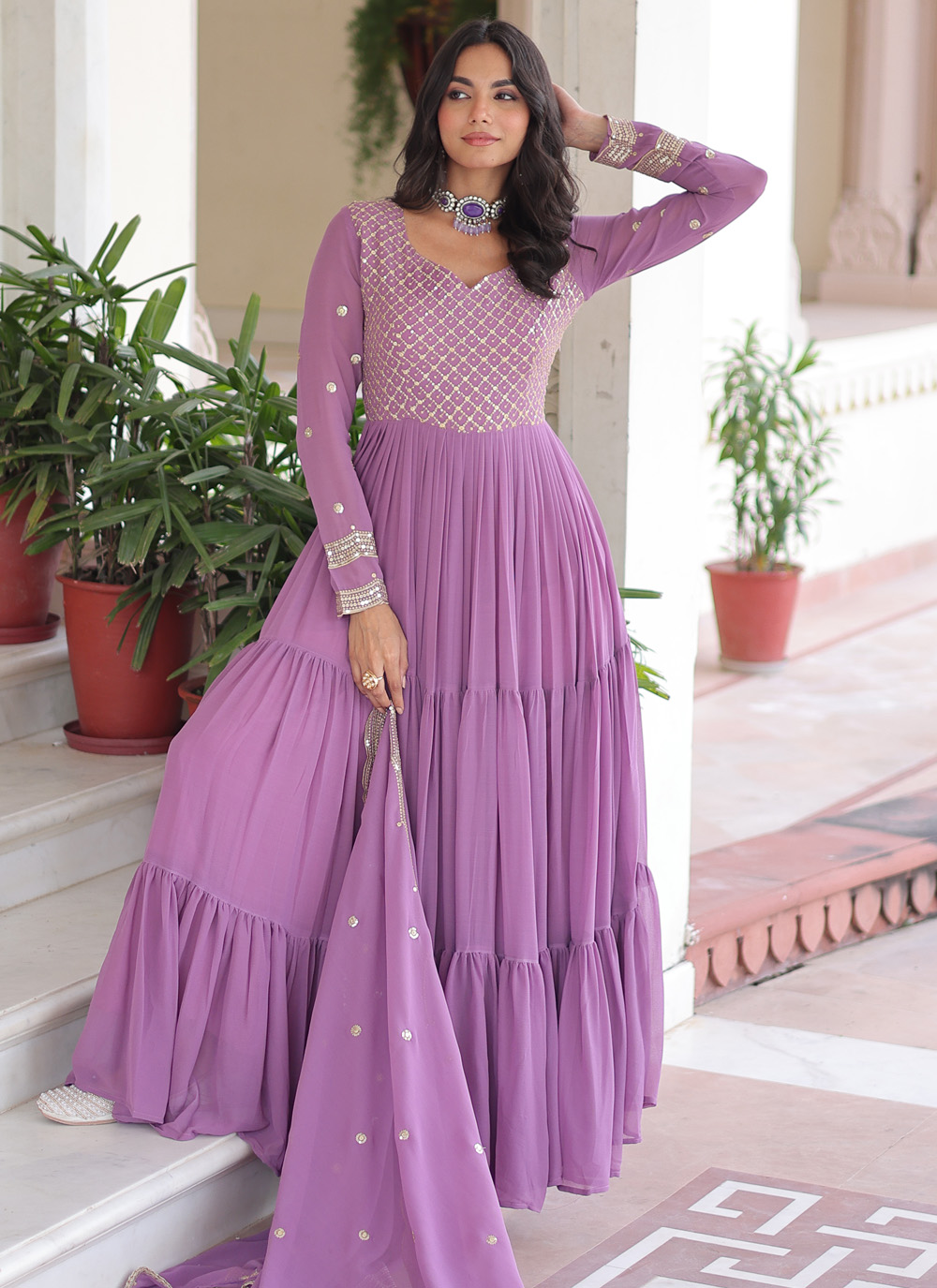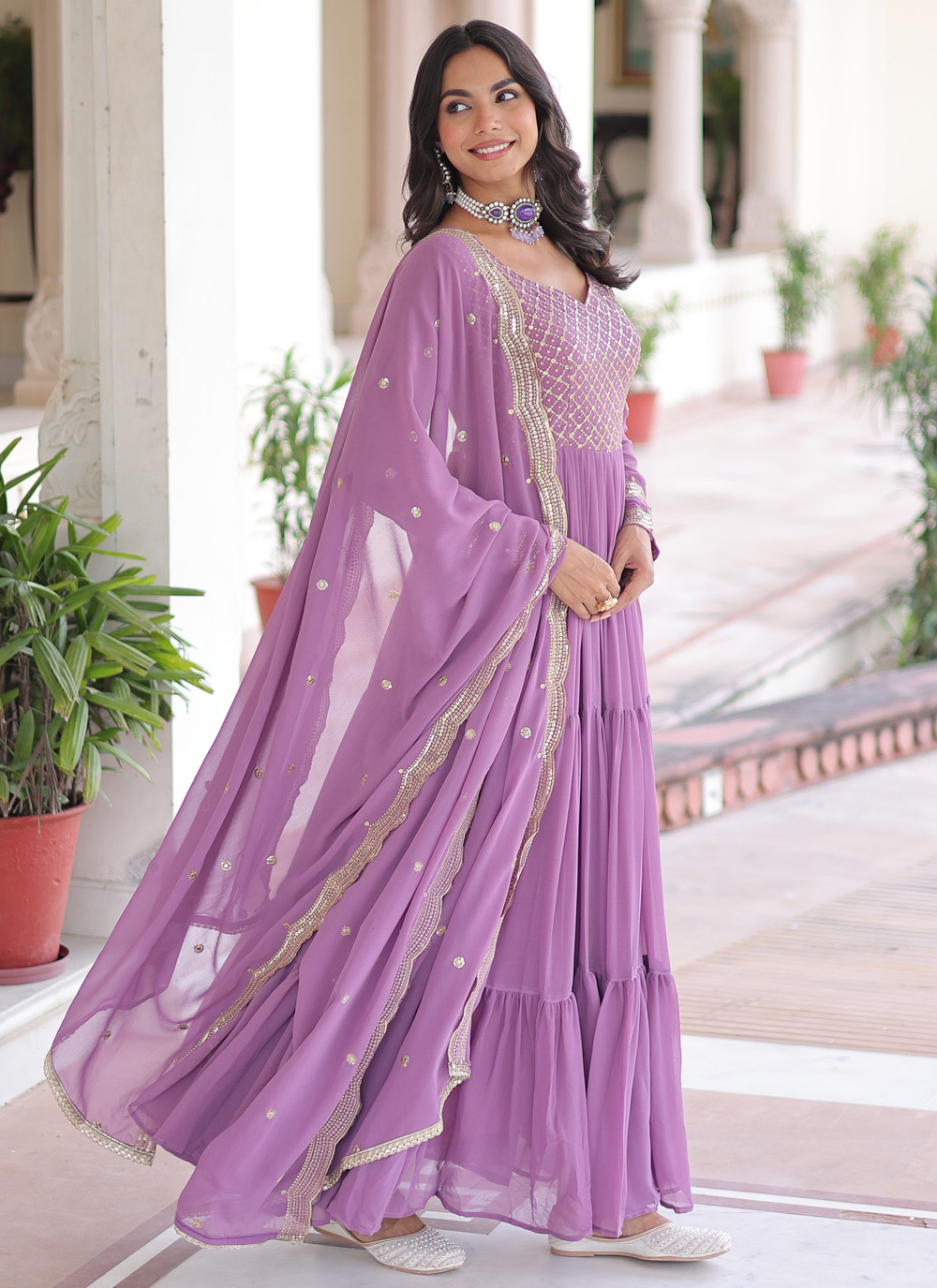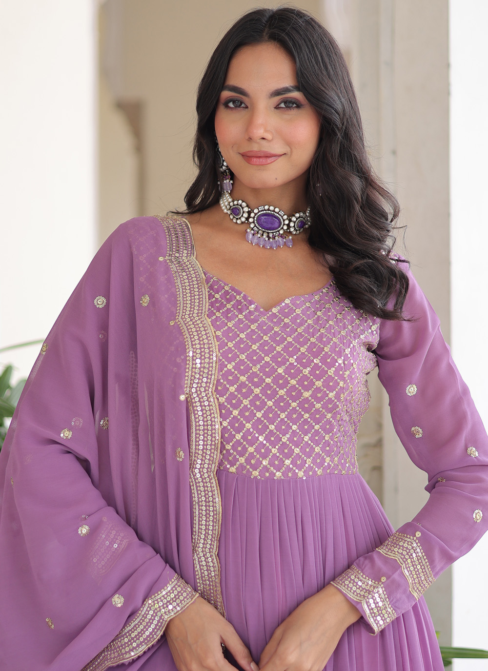 This gown stands out with its smooth faux georgette fabric and detailed sequins–Zari embellishments. The vibrant purple tone adds a graceful charm, making it a striking outfit for any special event. Comes with matching dupatta.