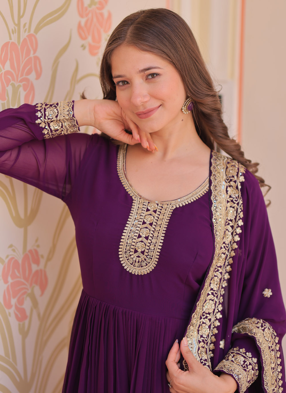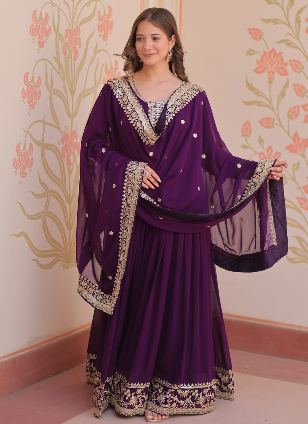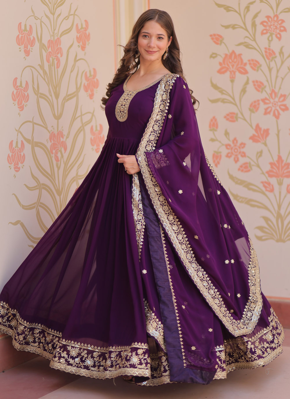 Radiate confidence and class in this beautifully embroidered Purple Readymade Gown. The faux georgette fabric drapes gracefully, while the intricate zari and sequin embellishments add sparkle and texture. Ideal for festive gatherings. Comes with matching dupatta.