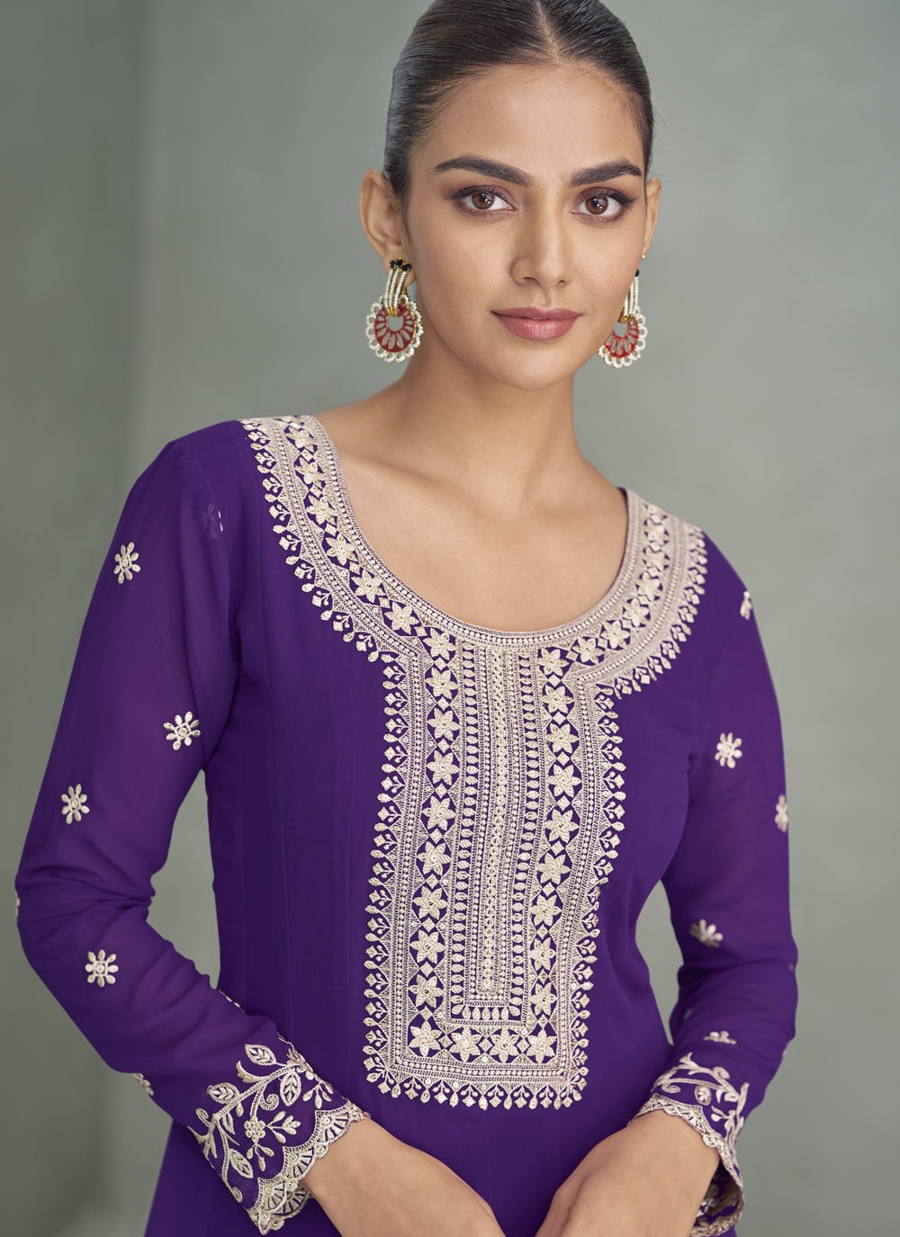 Turn heads with this designer Purple Gown in flowy georgette, accentuated by intricate sequin embroidery. The modern cut blends seamlessly with traditional aesthetics, making it a versatile pick for ceremonies or wedding functions. Comes with matching dupatta.