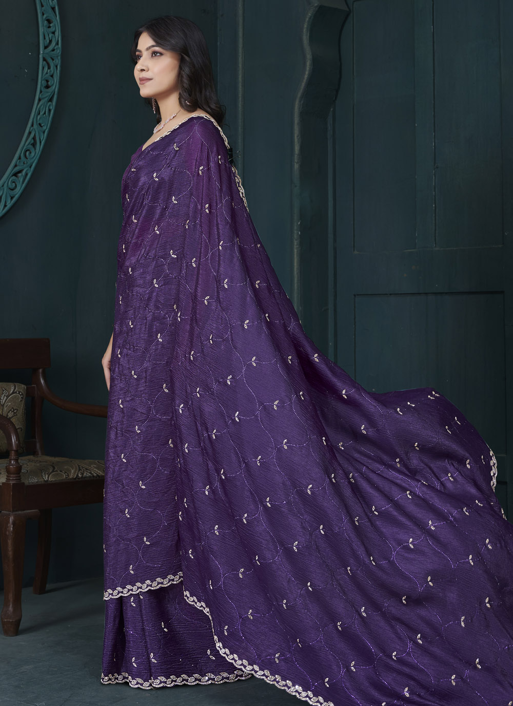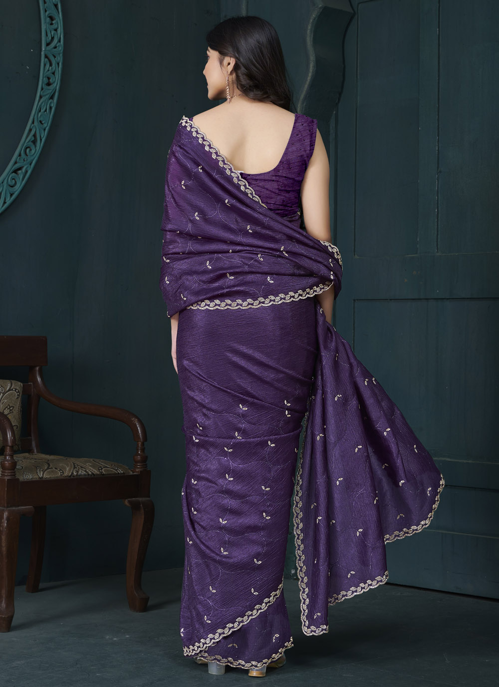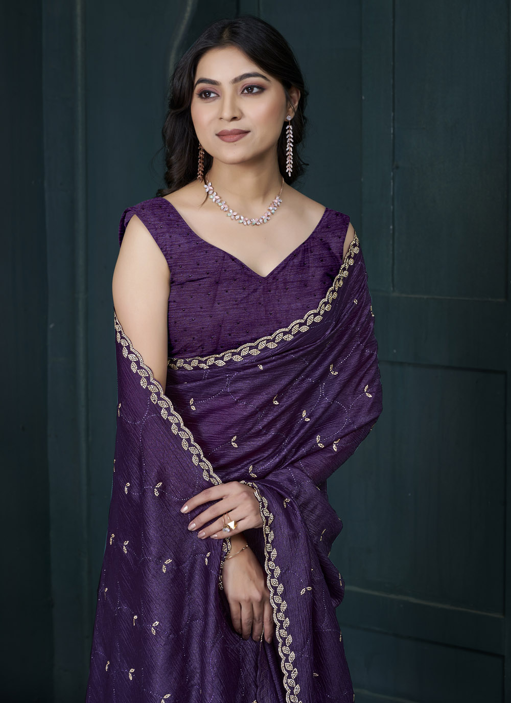 Celebrate tradition with elegance in this Purple Crepe Silk Saree, skillfully designed with delicate diamond and hand embroidery. The breathable crepe silk flows gracefully, making it ideal for long celebrations, religious ceremonies, or traditional functions. Comes with matching blouse.