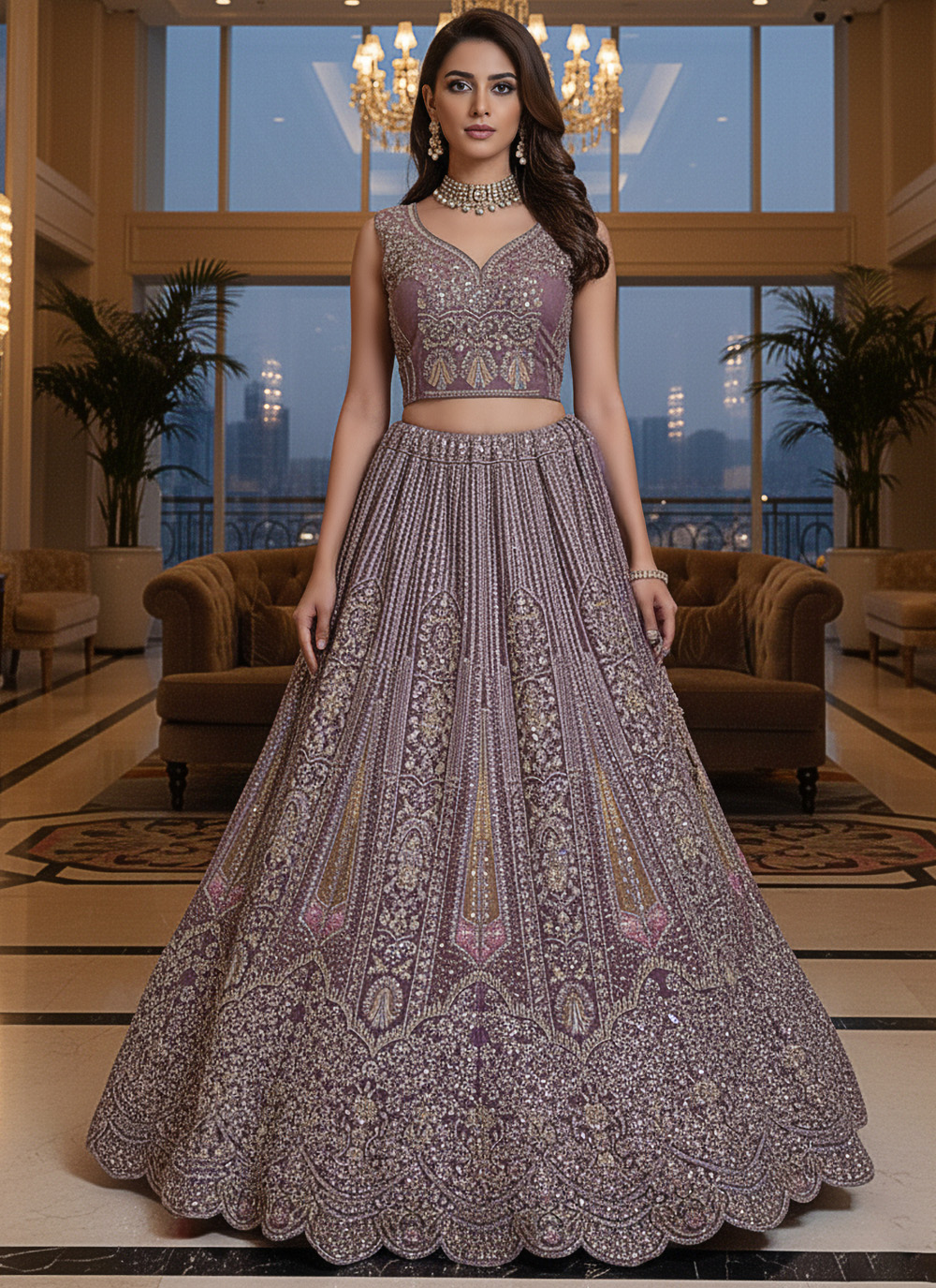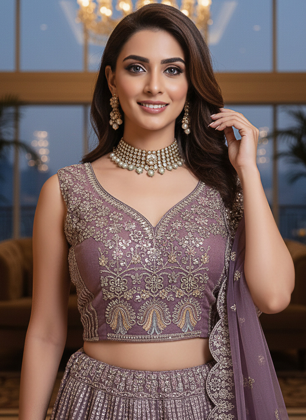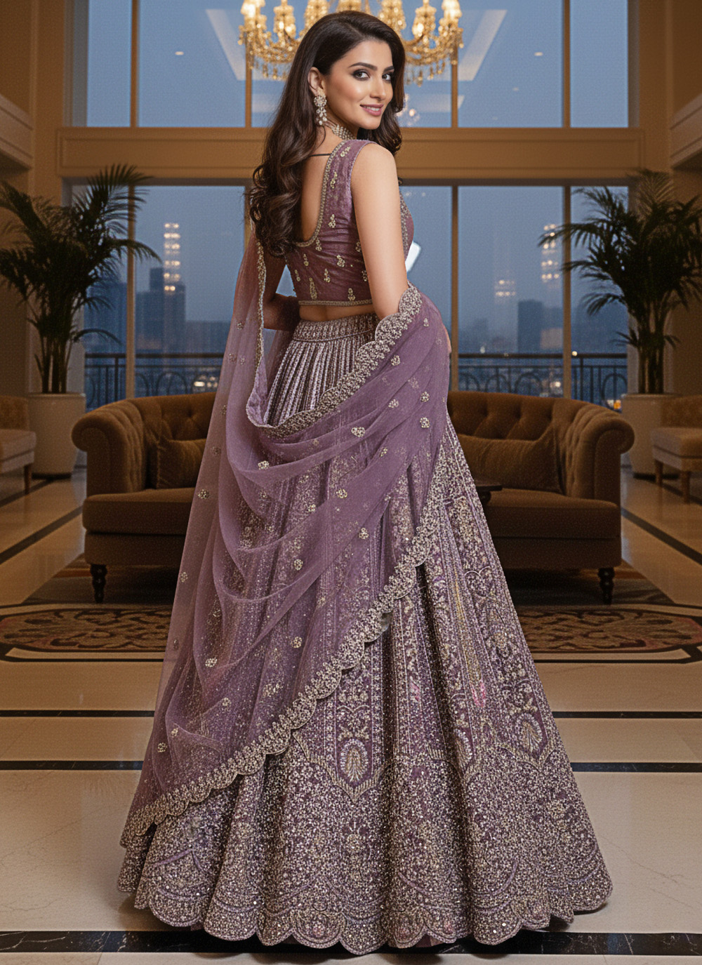Designed to make a lasting impression, this purple embroidered lehenga features shimmering sequins work layered with rich zari and dori patterns. The net flair moves gracefully, giving you a regal silhouette suitable for bridal events, sangeet and stylish ceremonies. Comes with matching choli and dupatta.