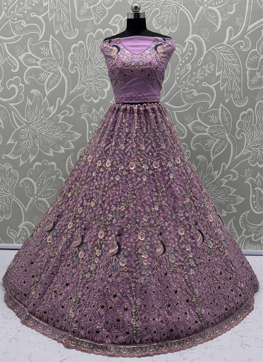 Make a breathtaking style statement with this Purple Net Dori Thread Lehenga Choli, exquisitely enhanced with zarkan stones and diamond highlights. The soft net fabric flows beautifully, offering both comfort and charm. Comes with matching choli and dupatta.