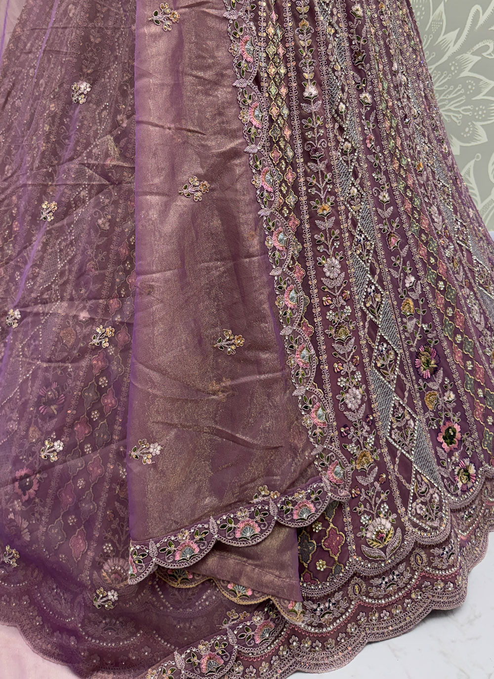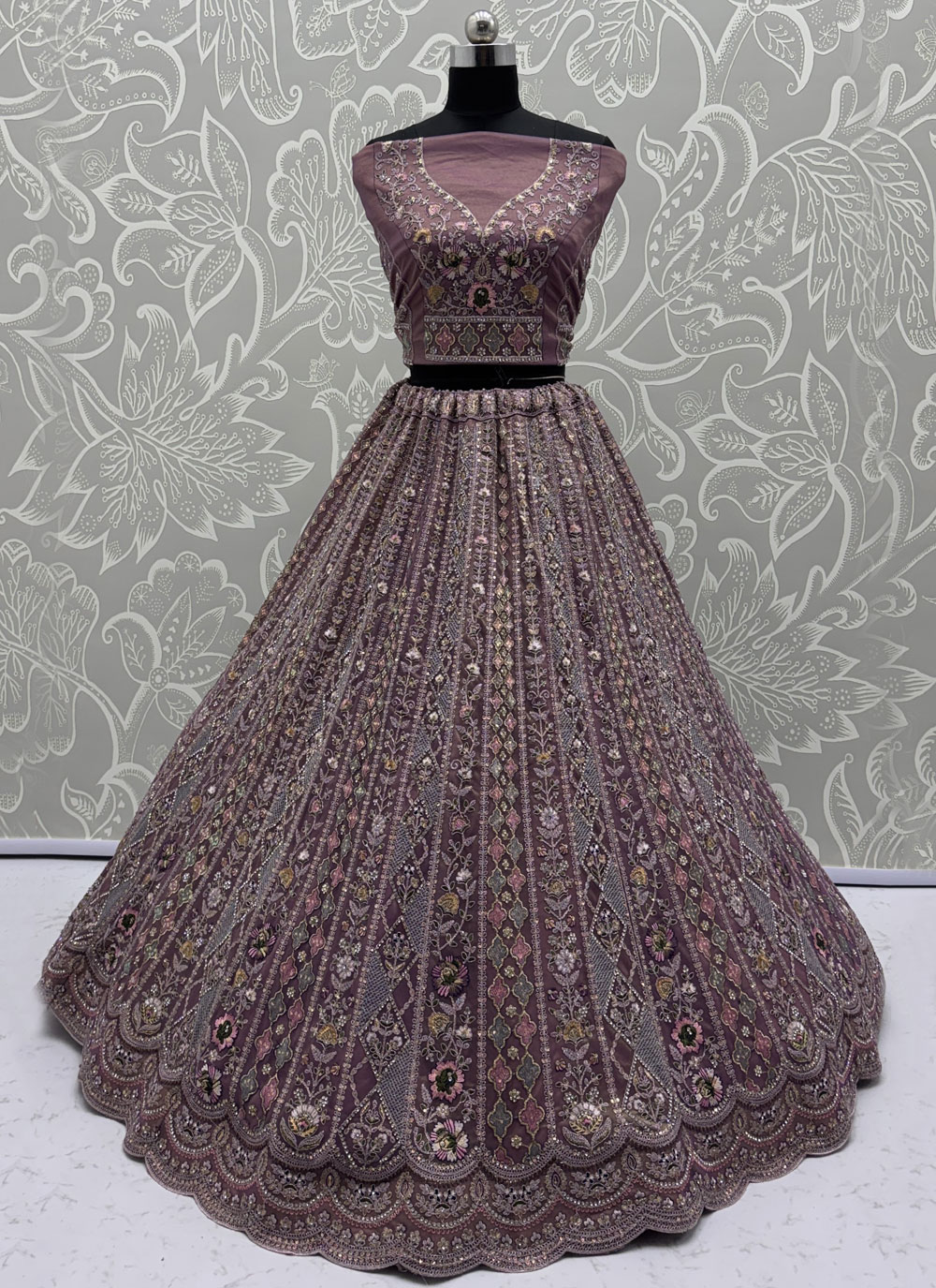 This purple net lehenga choli is beautifully crafted with sequins, zari, dori thread, and zarkan diamond embroidery. The rich detailing and graceful net fabric create a stunning trendy look for weddings and grand celebrations. Comes with matching choli and dupatta.