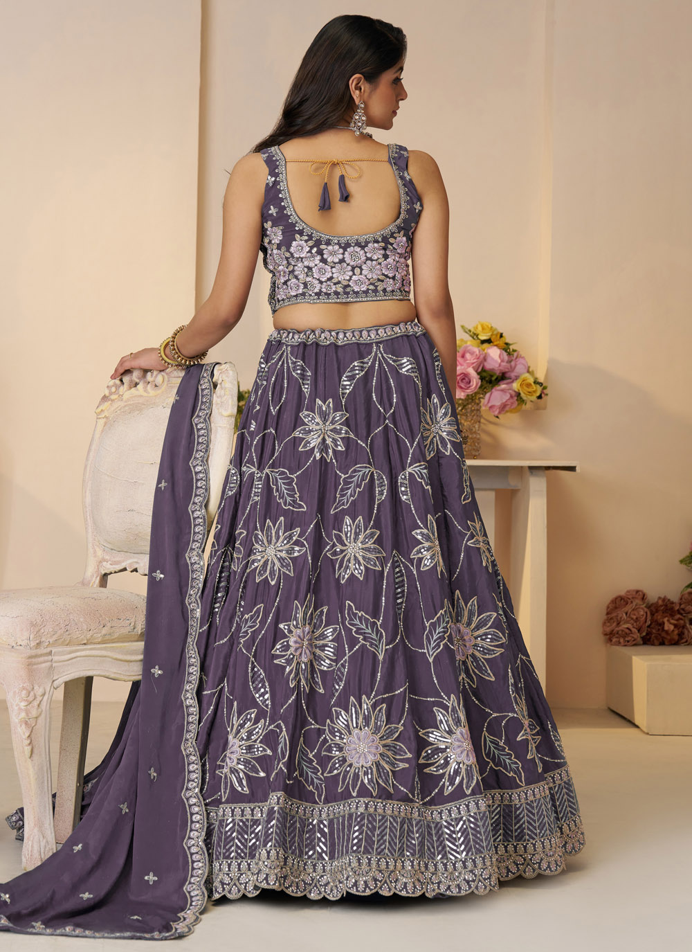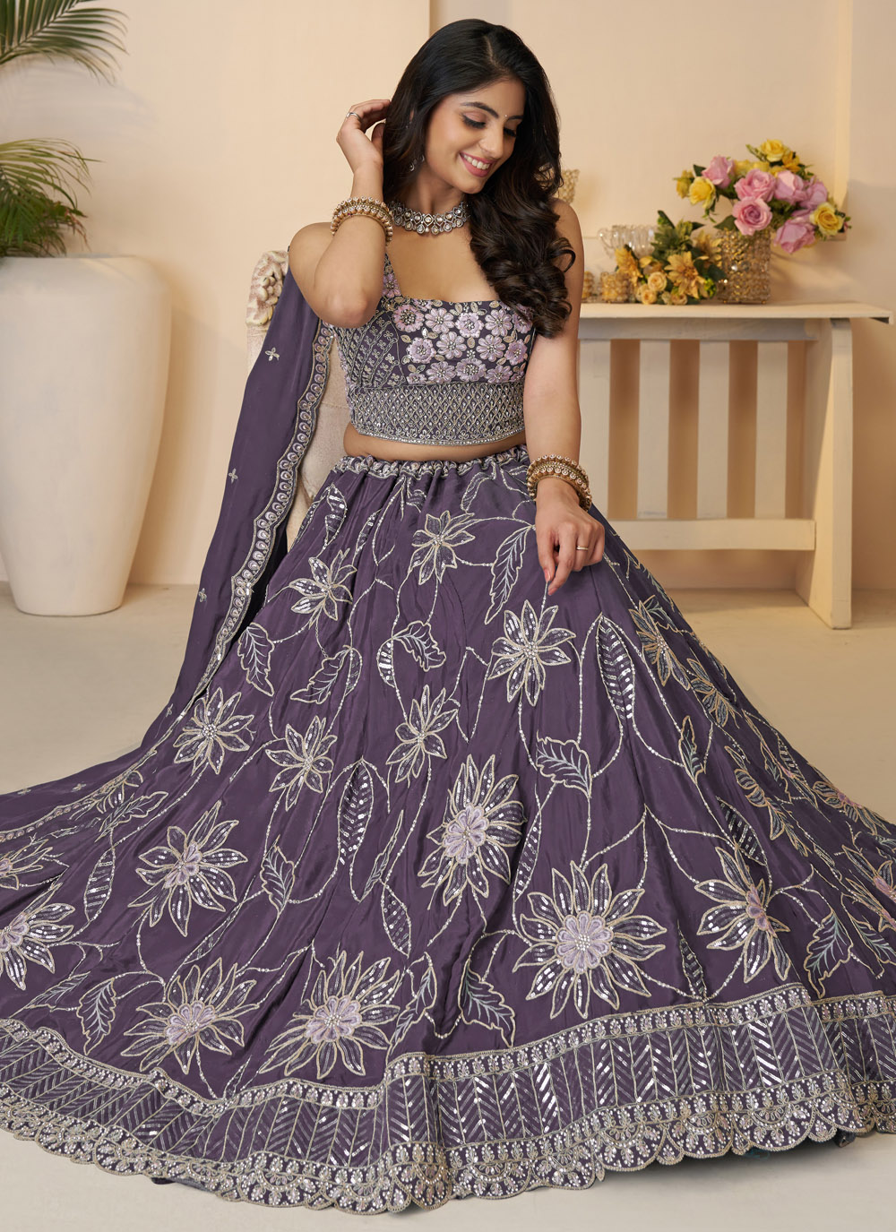 Make a royal statement in this Purple Satin Silk Lehenga Choli, exquisitely crafted with rich zari and thread embroidery, sparkling sequins, and delicate stone embellishments. Perfect for weddings, festive occasions, or glamorous celebrations. Comes with matching choli and dupatta.