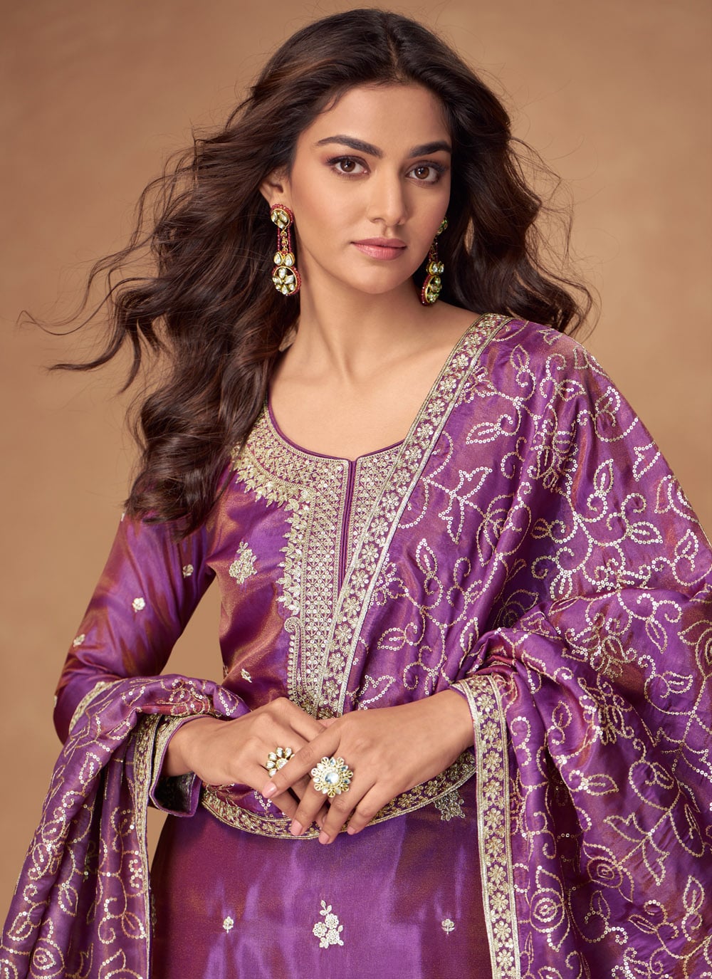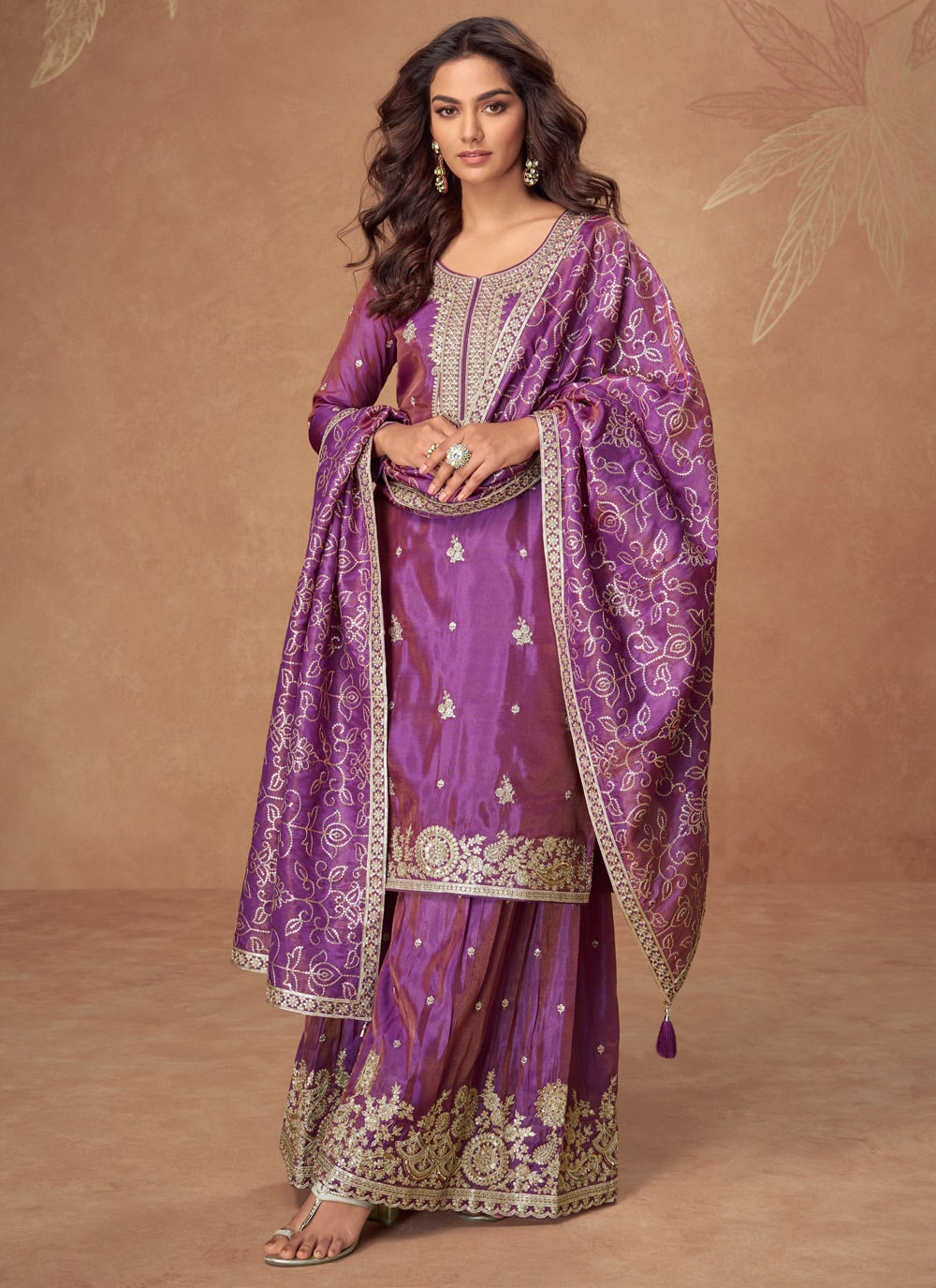 This designer purple shimmer palazzo suit is a true blend of glamour and grace. Embellished with sequins and zari work, it creates a sophisticated silhouette. Comes with matching bottom and dupatta.