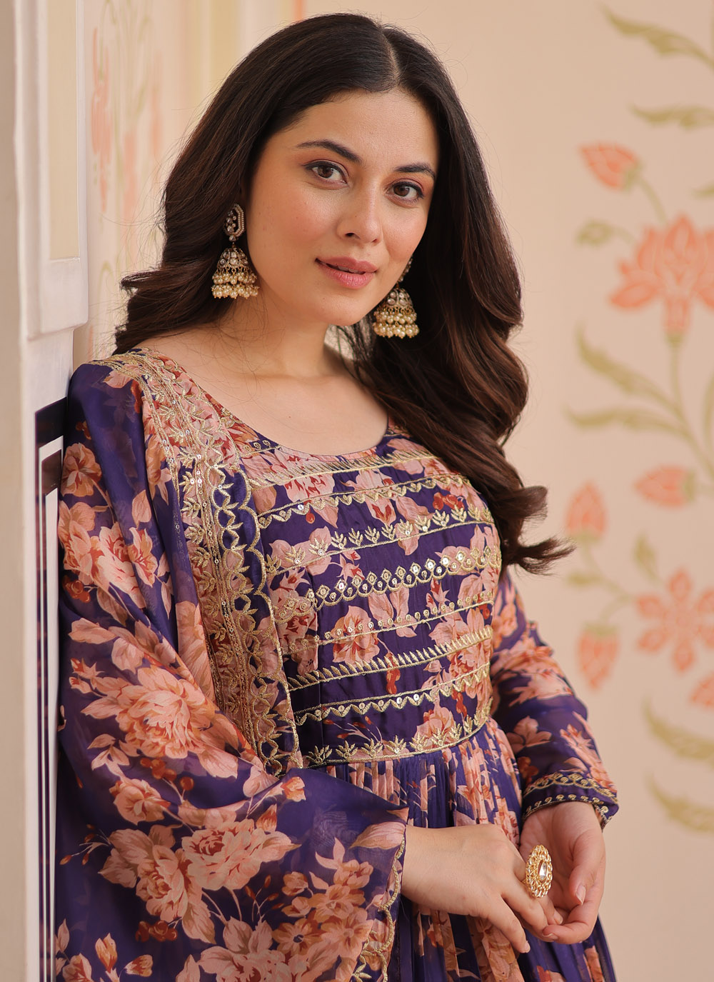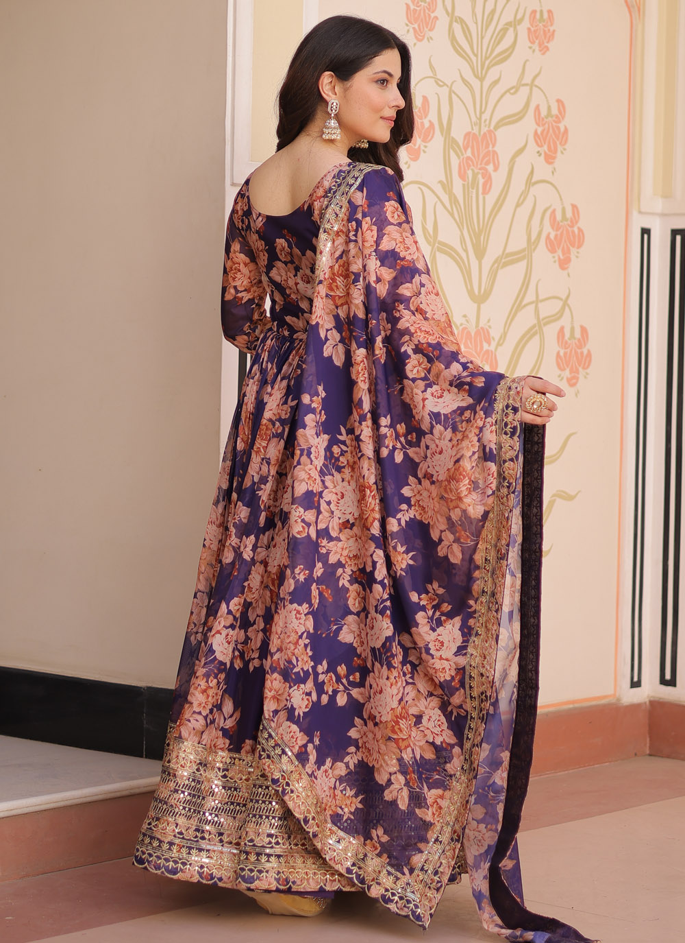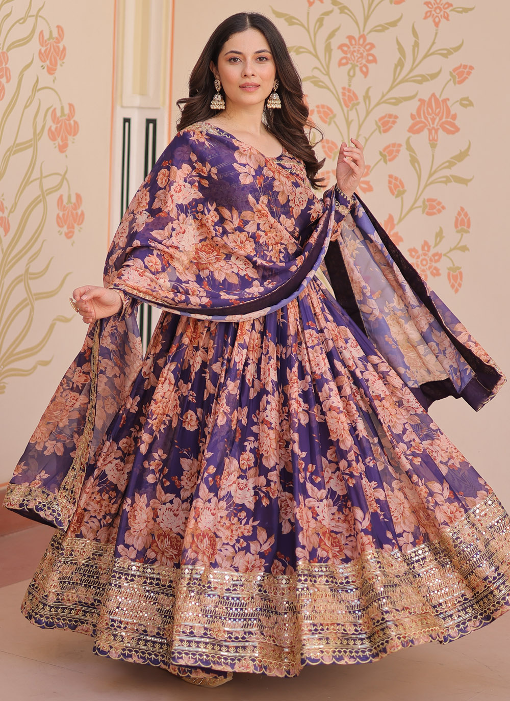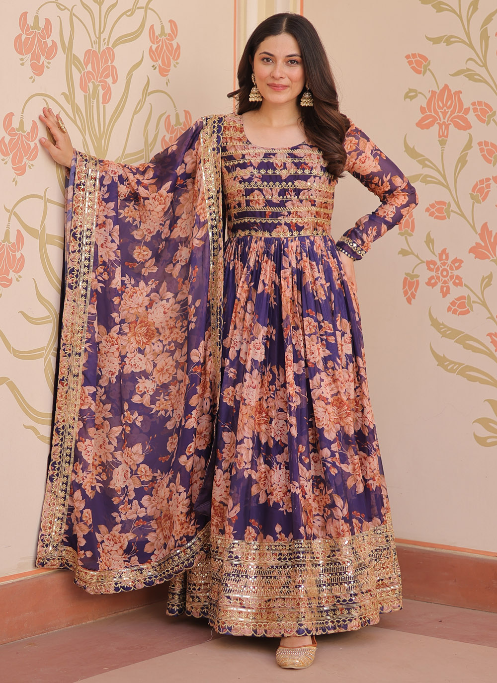 Embrace timeless beauty in this Purple Silk Gown, featuring exquisite digital print patterns and shimmering sequins embroidery. The luxurious silk drapes effortlessly, making this gown the perfect choice for weddings, receptions and festive soirées. Comes with matching dupatta.