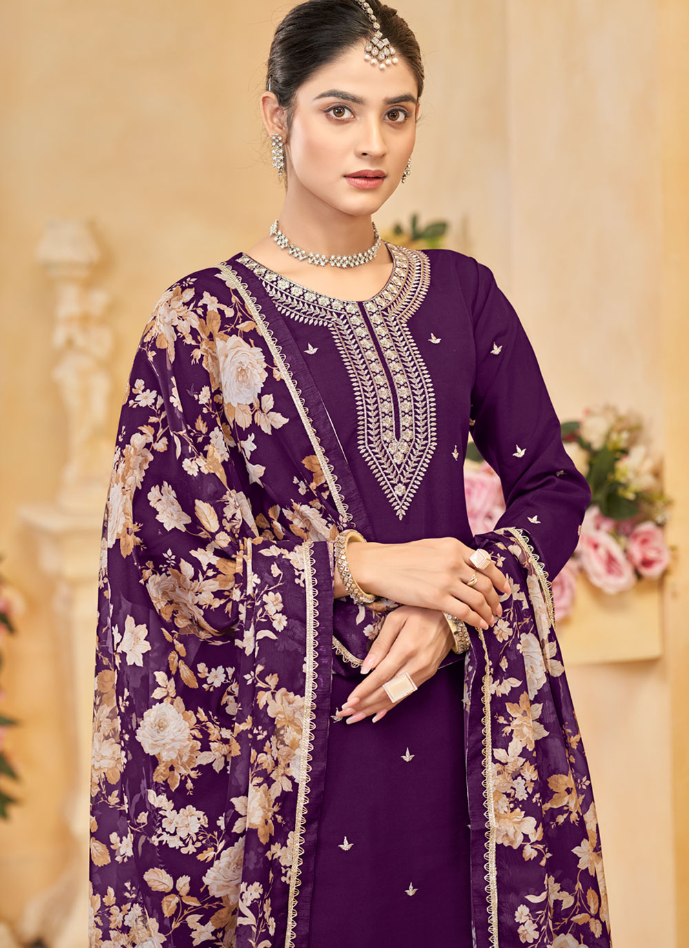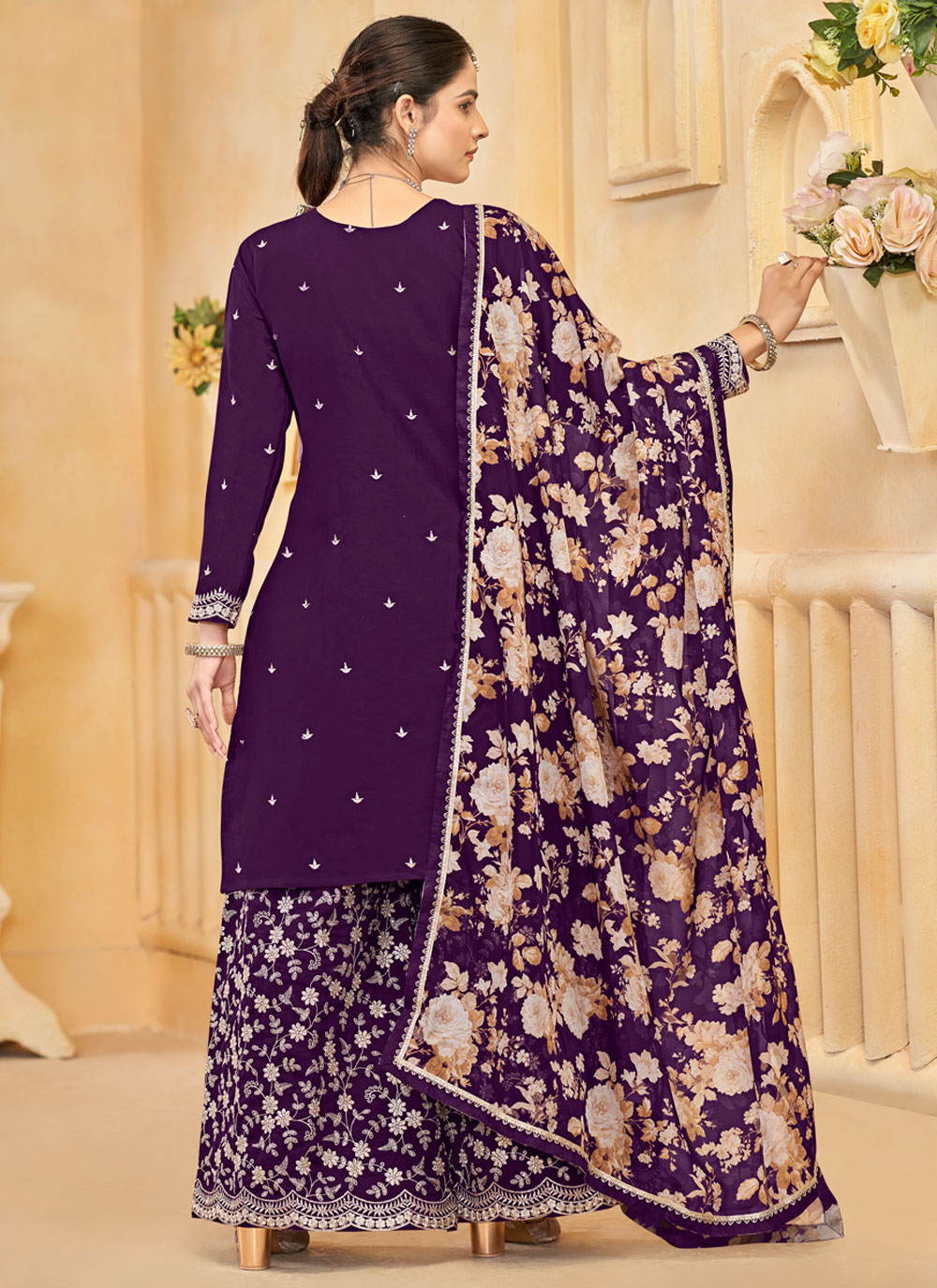 Add a touch of luxury to your wardrobe with the Purple Silk Embroidered Designer Palazzo Salwar Suit. Intricate embroidery paired with a matching bottom and dupatta makes this the perfect ensemble for any celebration or formal occasion.