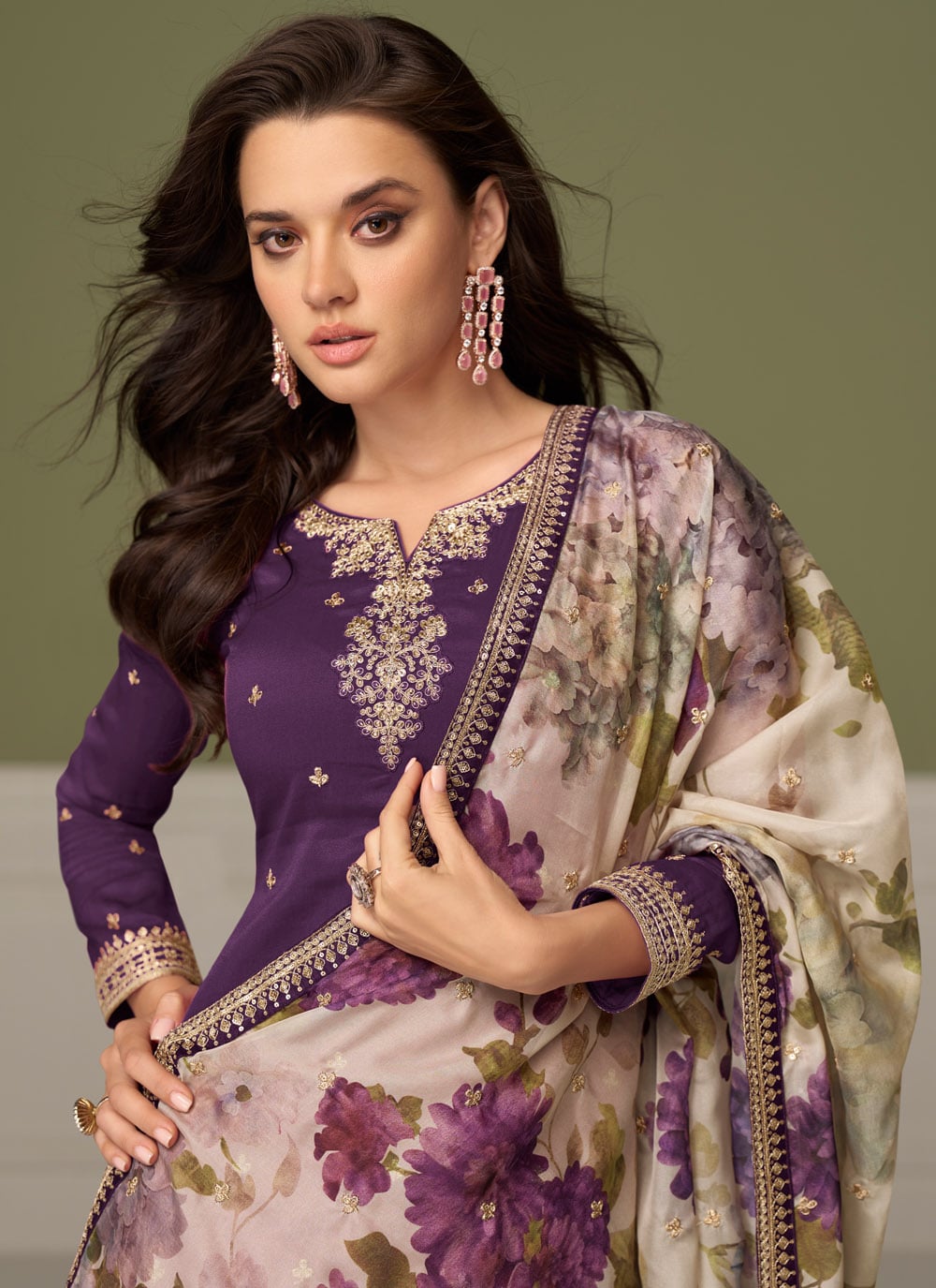 Designed for festive occasions, this trendy silk salwar kameez in purple brings sophistication with every detail. The embroidery highlights the luxurious texture of silk, making it ideal for celebrations where you want to feel stylish yet rooted in tradition. Comes with matching bottom and dupatta.
