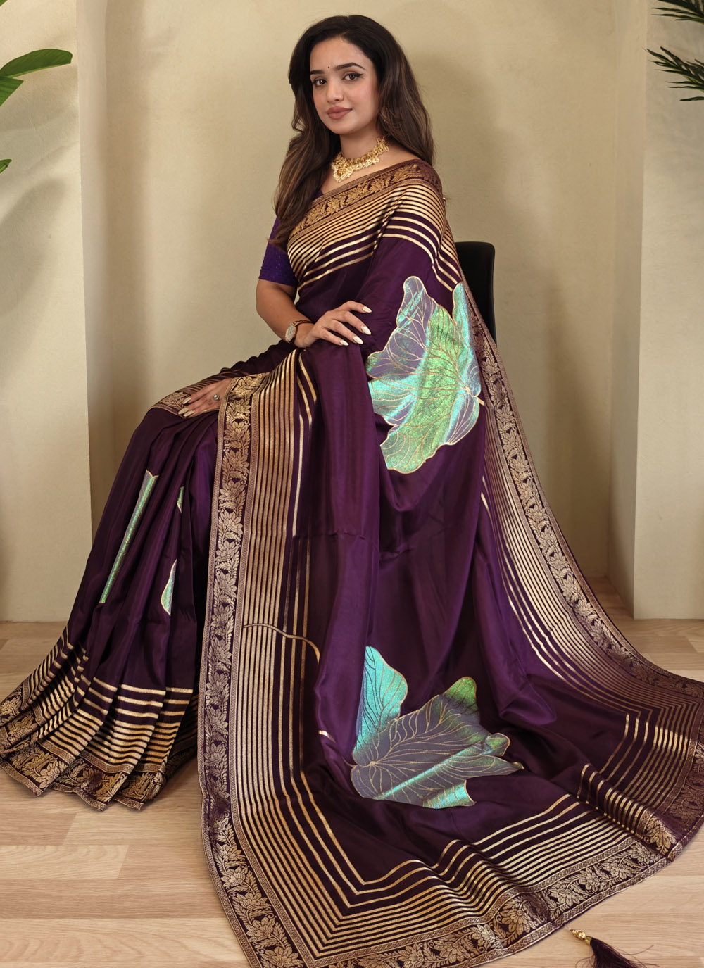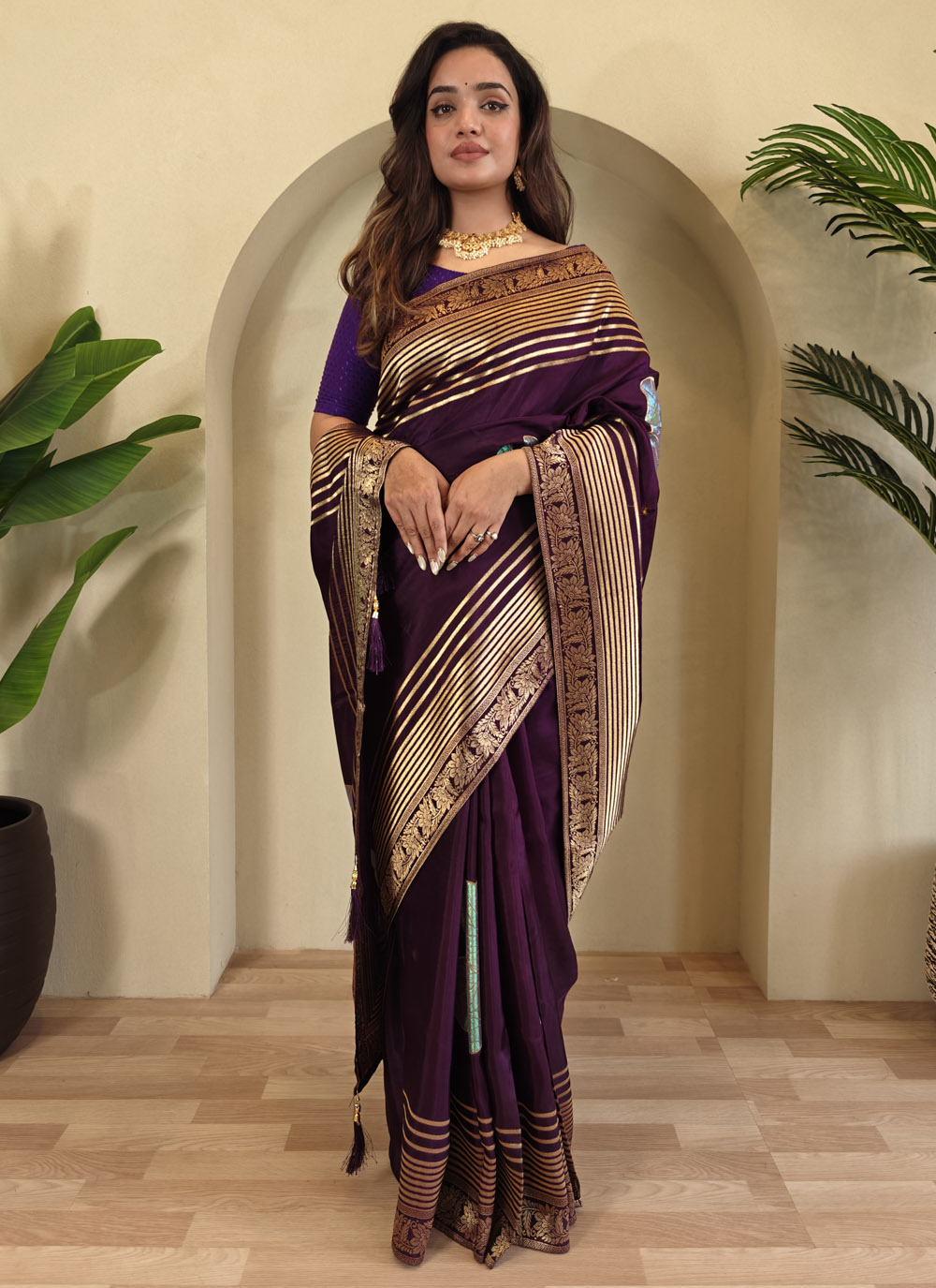 Drape yourself in elegance with this Purple Silk Saree featuring exquisite floral zari weaving. The rich silk fabric paired with intricate floral patterns gives it a royal touch, making it ideal for receptions, festive occasions, and cultural gatherings. Comes with matching blouse.