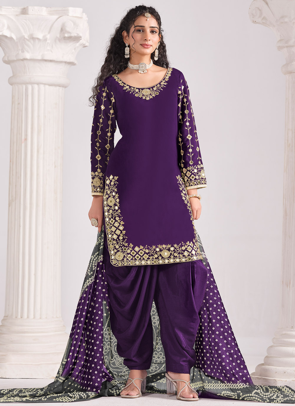 Grace your festive moments with this purple silk salwar suit, beautifully designed with rich zari and shimmering mirror embroidery. A classy designer outfit for weddings and celebrations. Comes with matching bottom and dupatta.