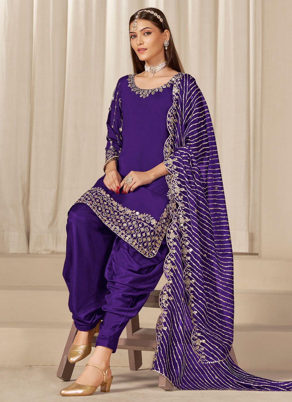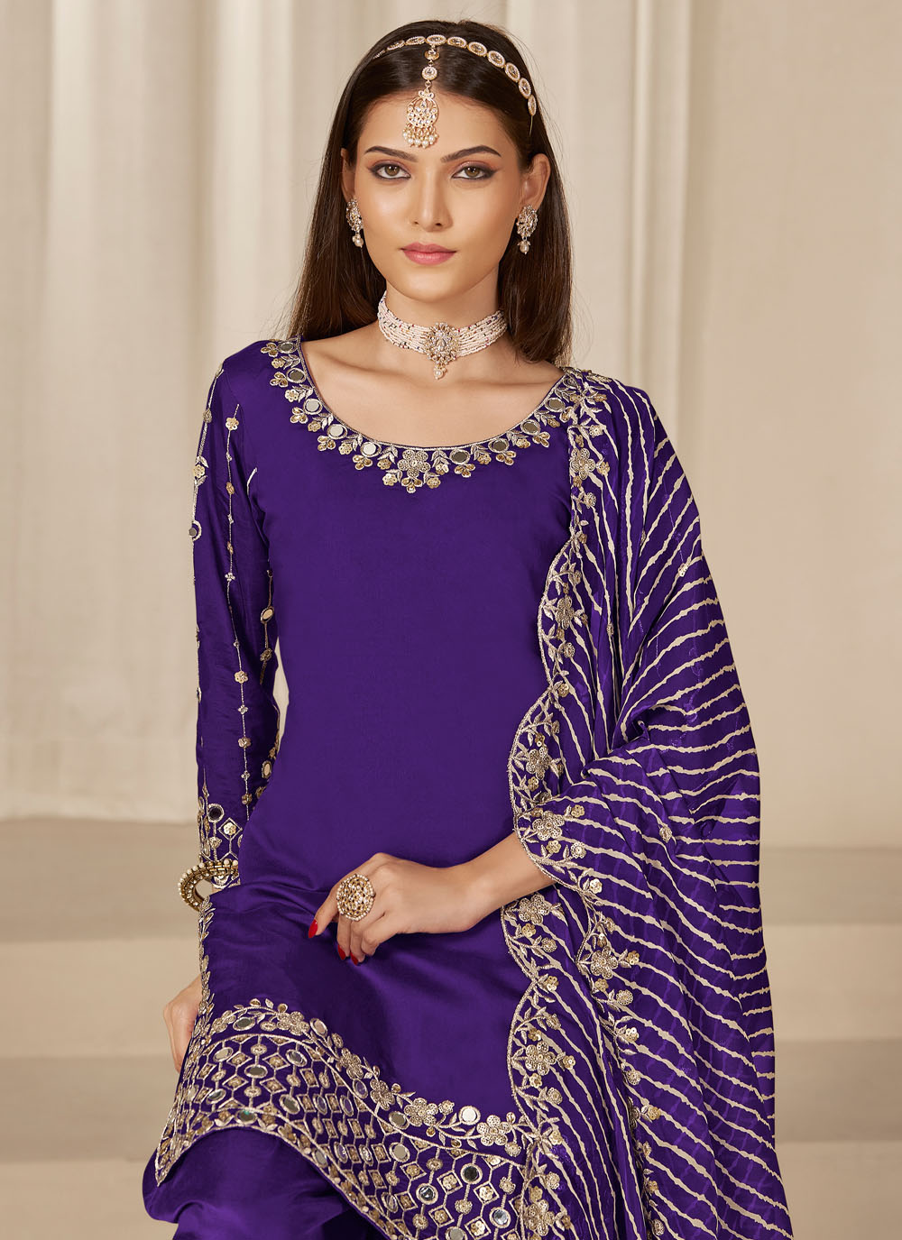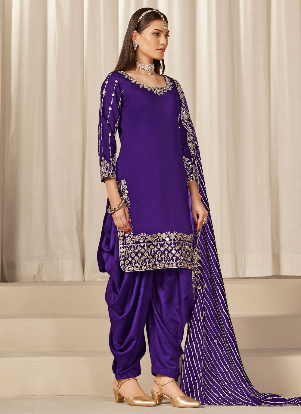 Celebrate culture in color with our Purple Mirror Work Patiala Salwar Suit crafted in rich silk. With traditional zari embroidery, sequin highlights and hand-finished mirror detailing, this outfit brings old-world charm with a fresh twist. Comes with matching bottom and dupatta.