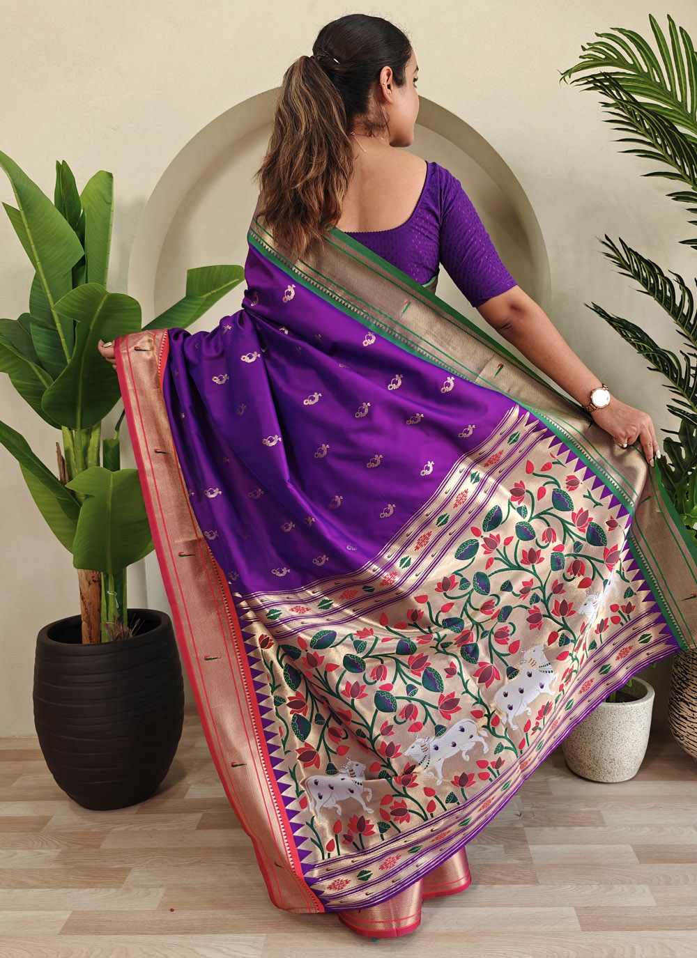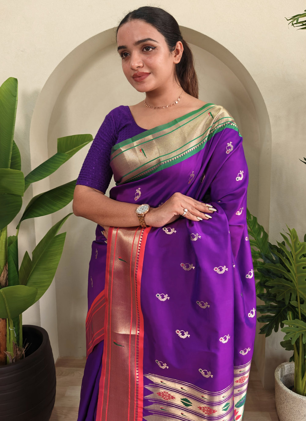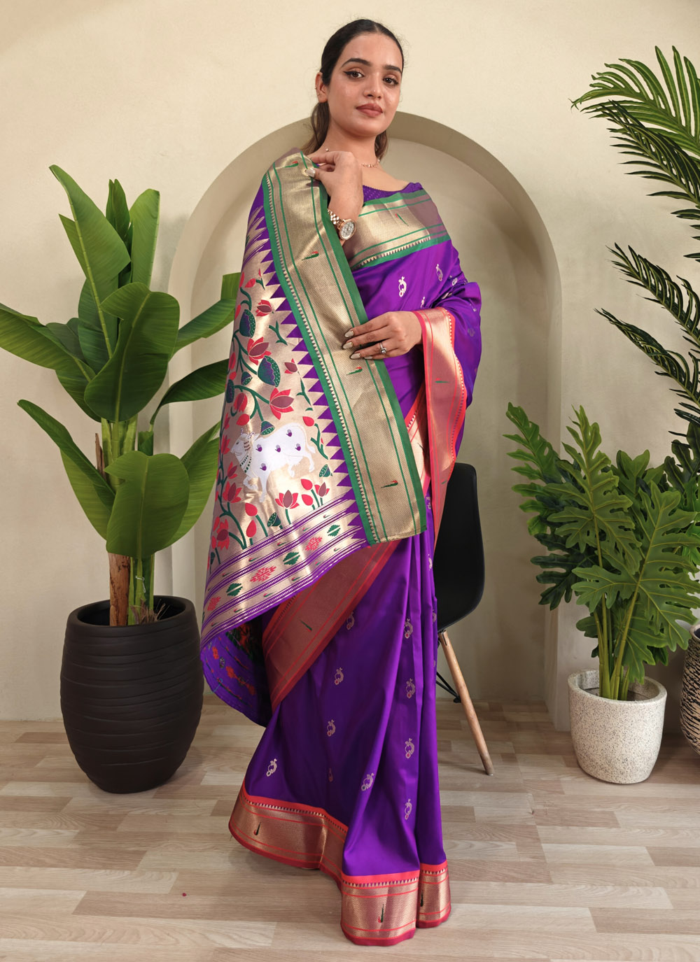 Drape yourself in opulence with this Purple Silk Woven Festival Trendy Saree. Featuring intricate woven motifs and a rich purple hue, this saree is designed to turn heads at festive gatherings, weddings, and grand celebrations. Comes with matching blouse.