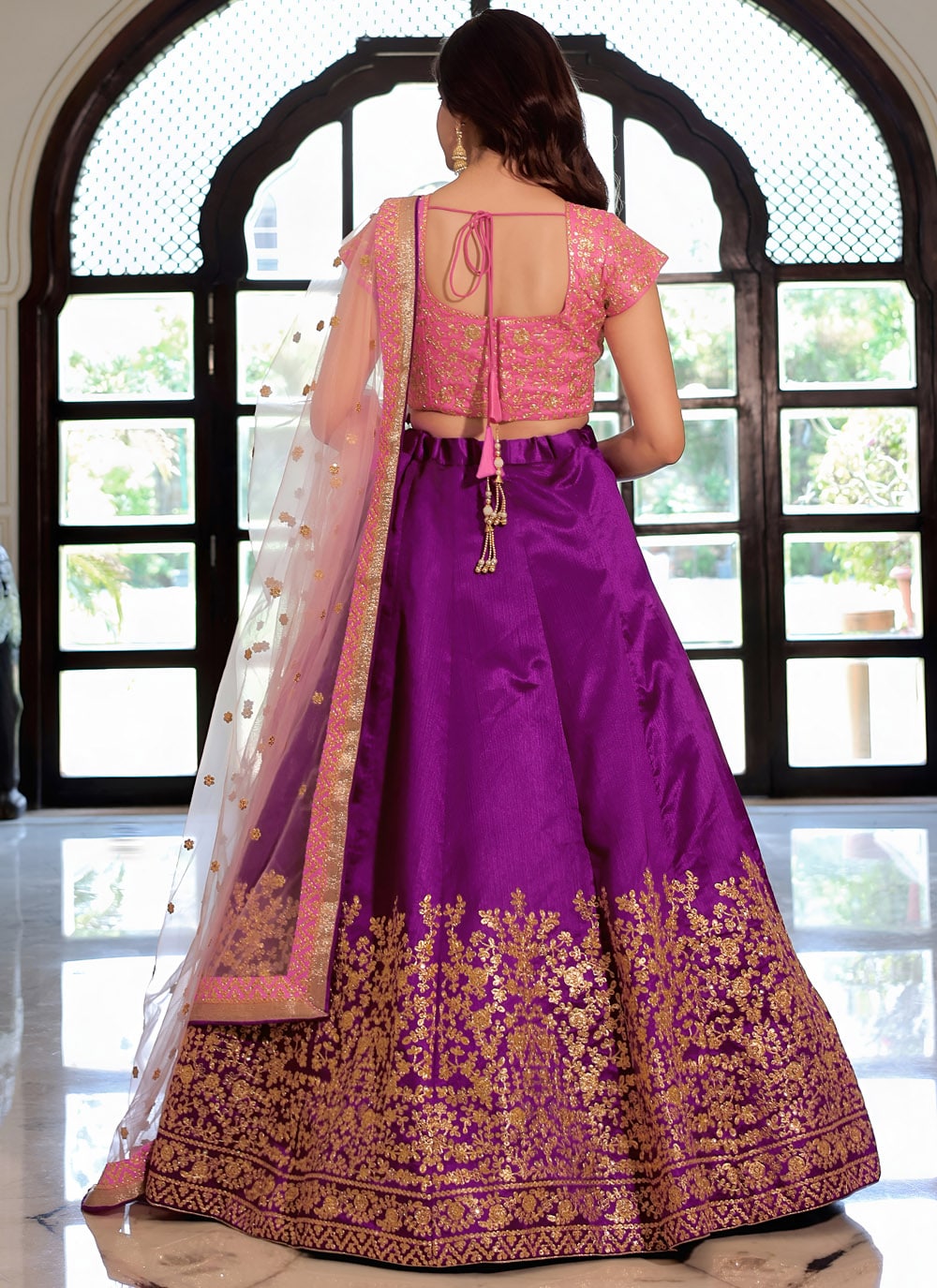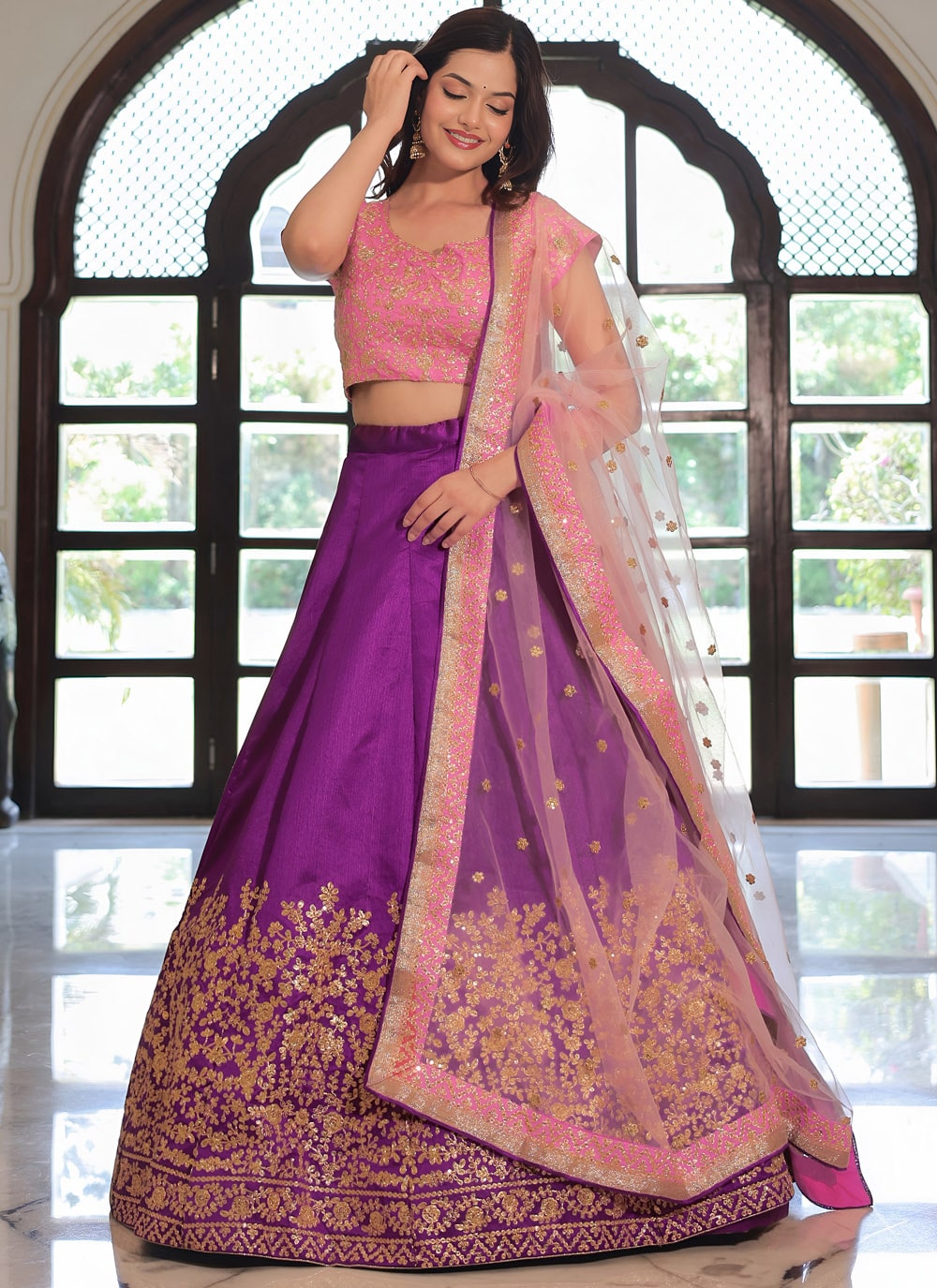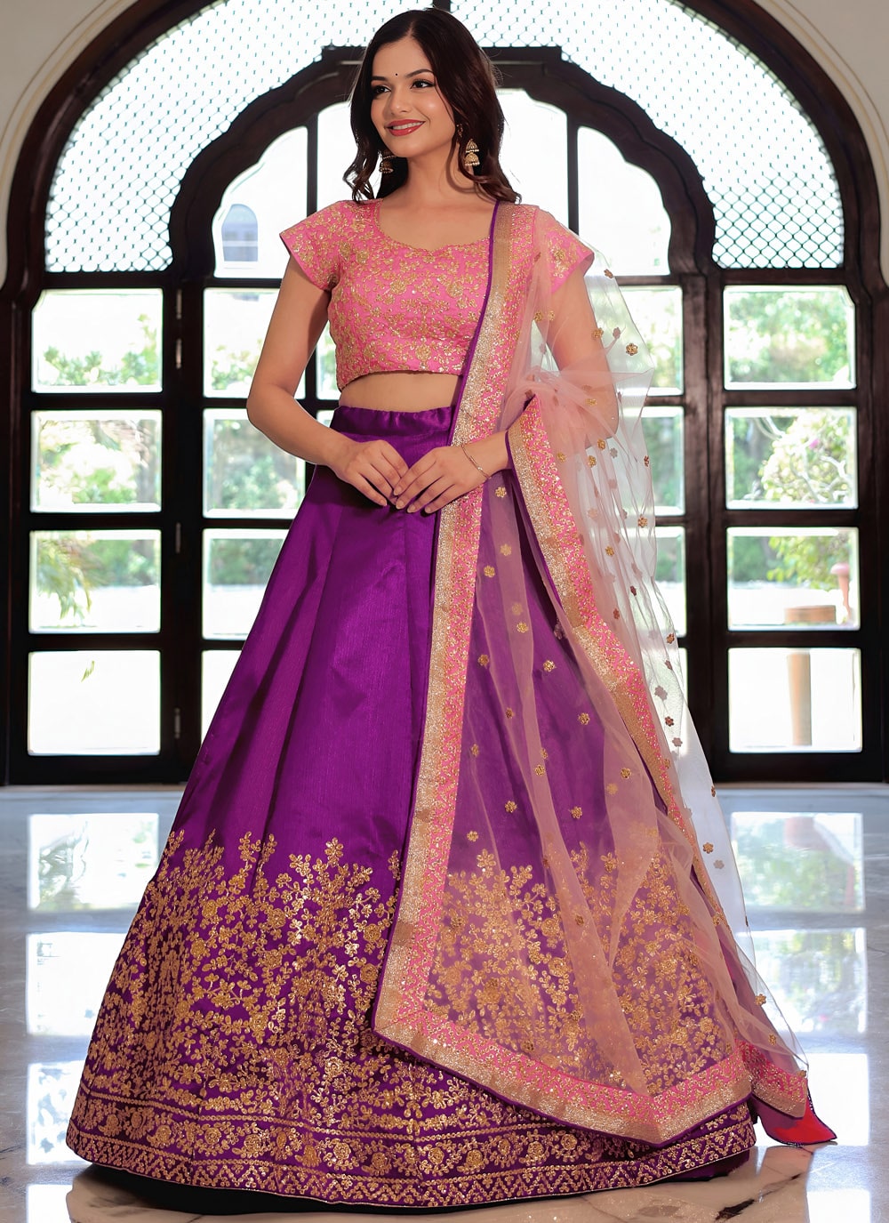 Make a regal statement with this Purple Silk A-Line Lehenga Choli, adorned with intricate zari dori embroidery and sparkling sequins. Perfect for weddings, receptions, and festive celebrations, its silk fabric ensures a flowing and elegant silhouette. Comes with matching choli and dupatta.