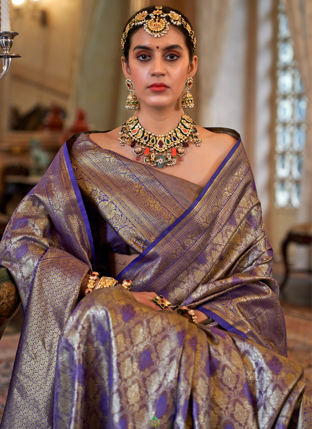 This purple silk saree brings a timeless traditional charm with its rich zari weaving work. The smooth fabric drapes gracefully, while the golden woven patterns add a regal touch. Comes with matching blouse.