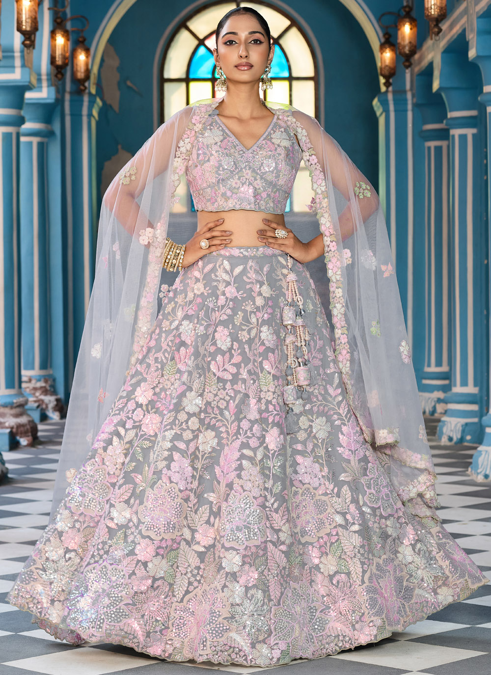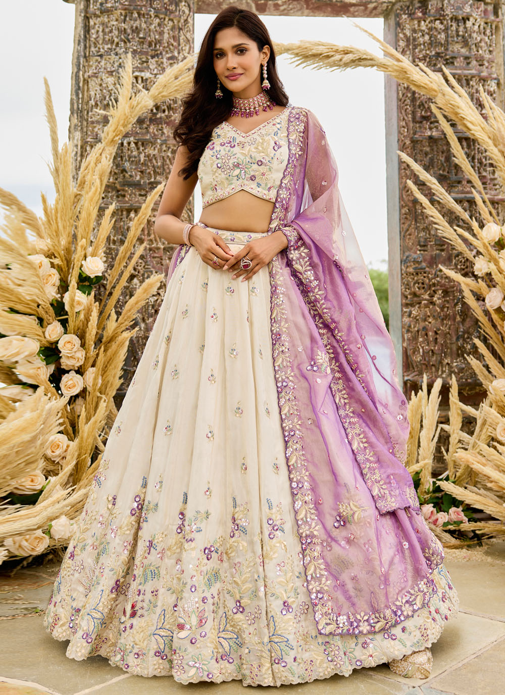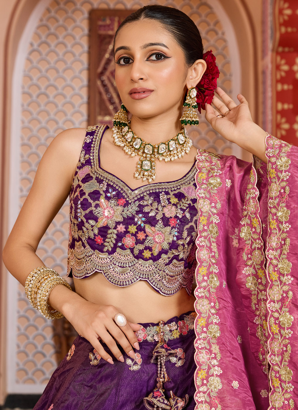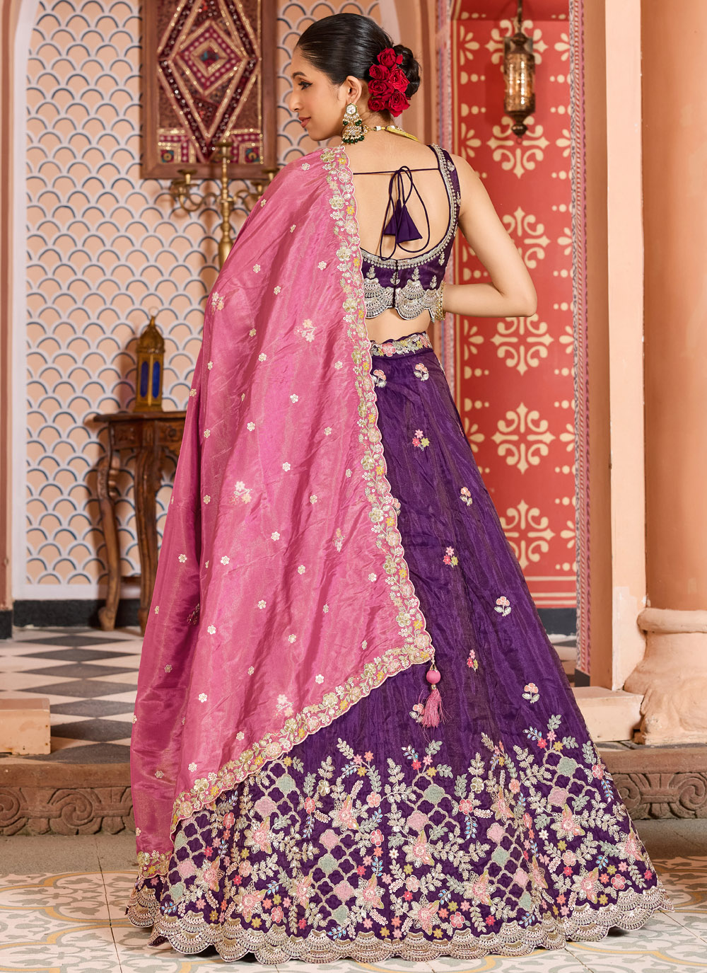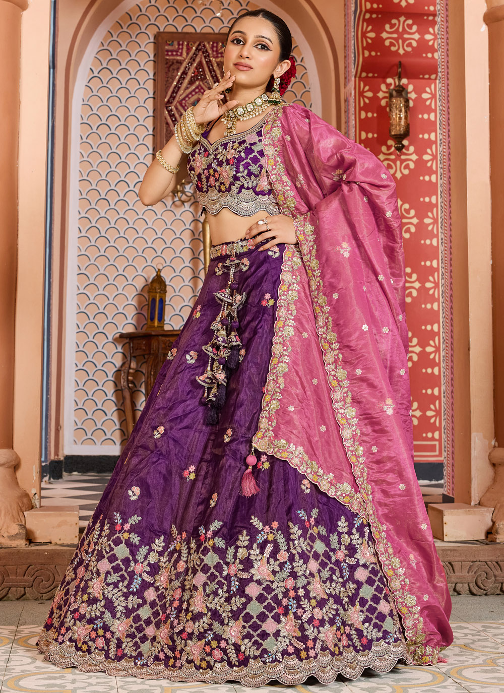 This designer purple tissue lehenga choli brings a charming blend of traditional artistry and modern appeal. The delicate embroidery enhances the lehenga with detailed beauty. Perfect for weddings, sangeet nights, and special celebrations where style meets comfort. Comes with matching choli and dupatta.