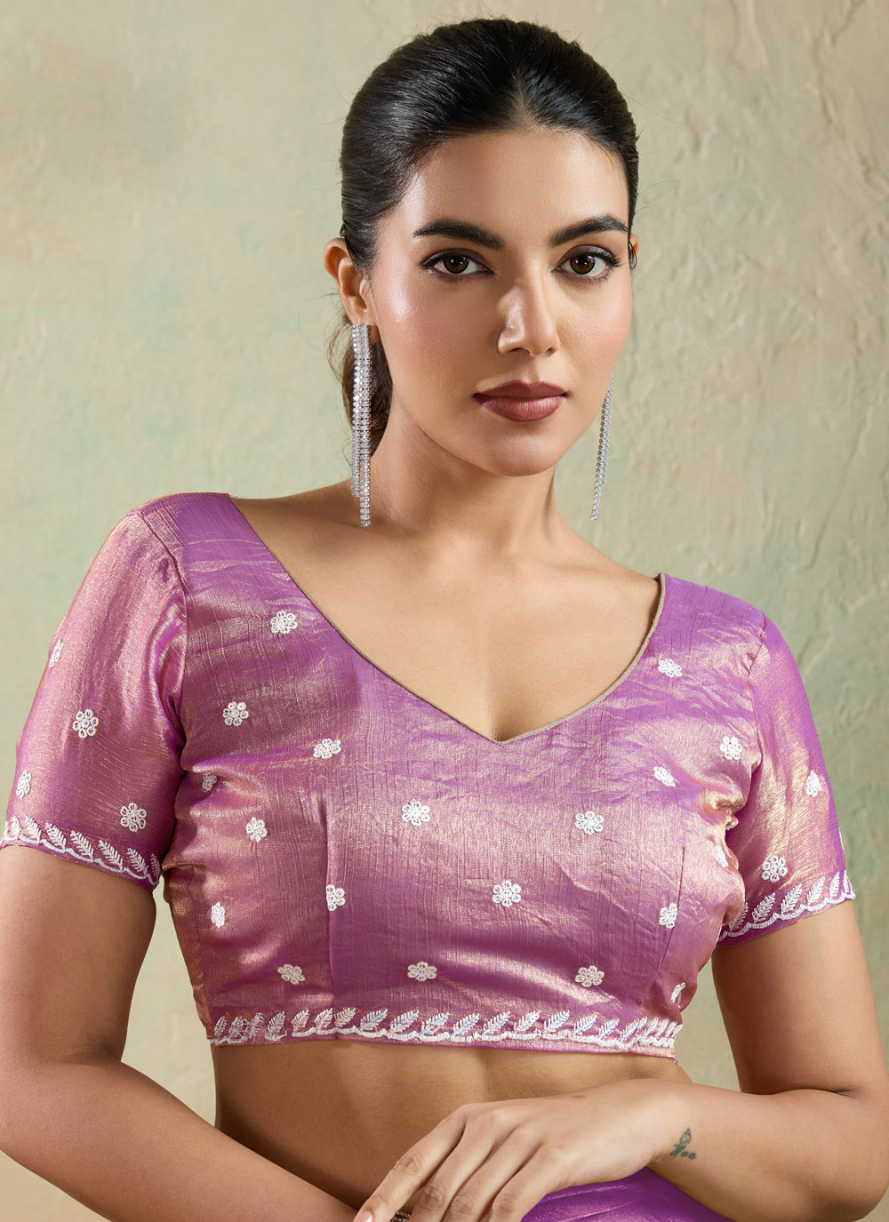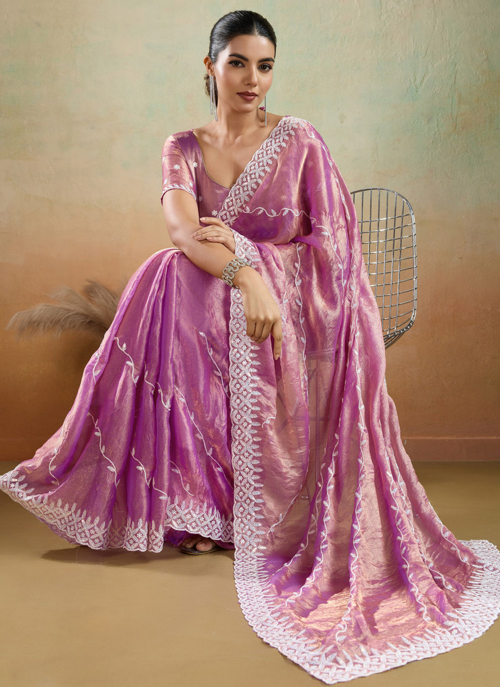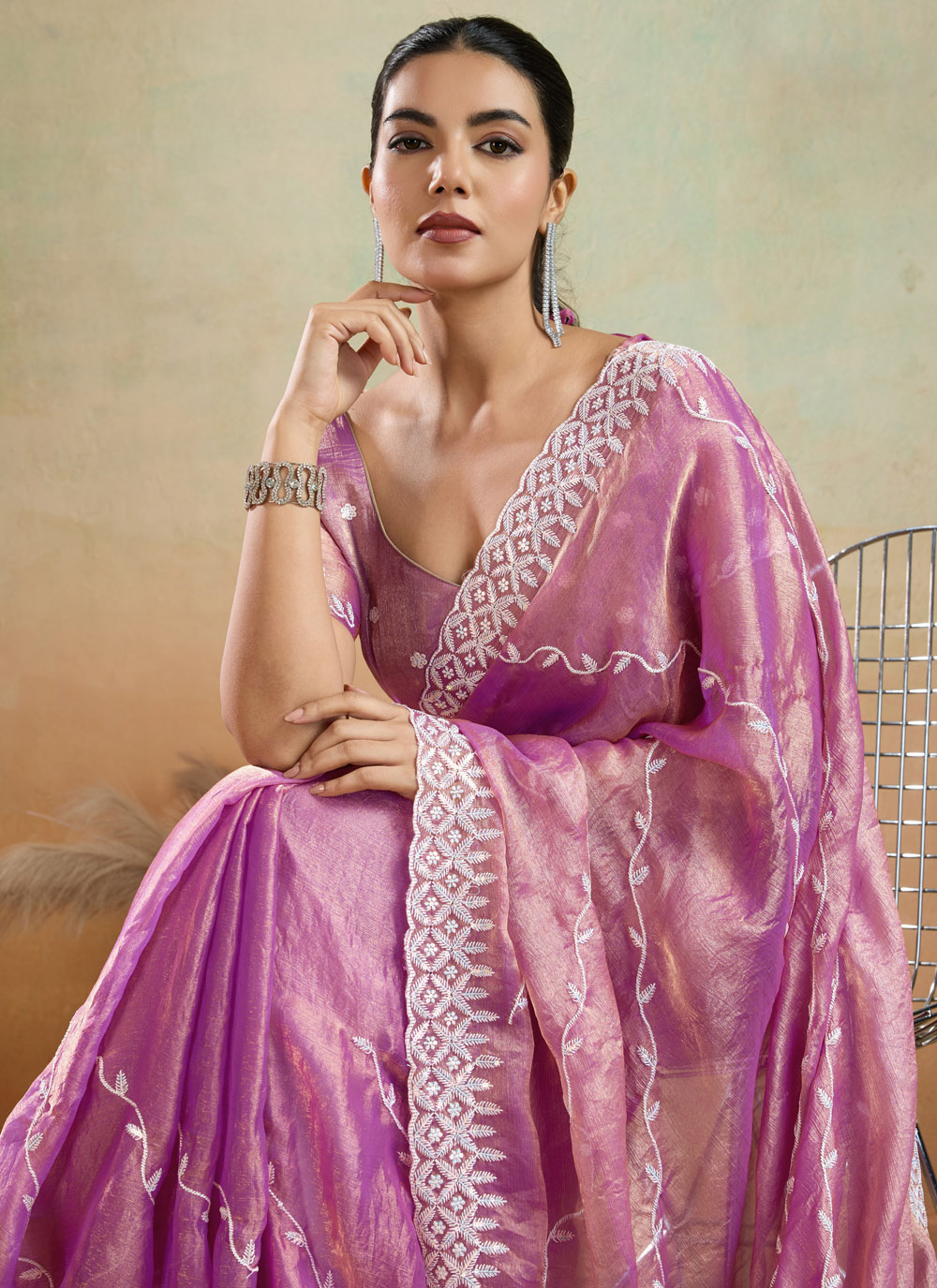 This purple velvet chiffon saree is styled with elegant thread embroidery. The designer appeal makes it perfect for festive and party occasions. Lightweight chiffon drape adds comfort with a graceful fall. Comes with matching blouse.