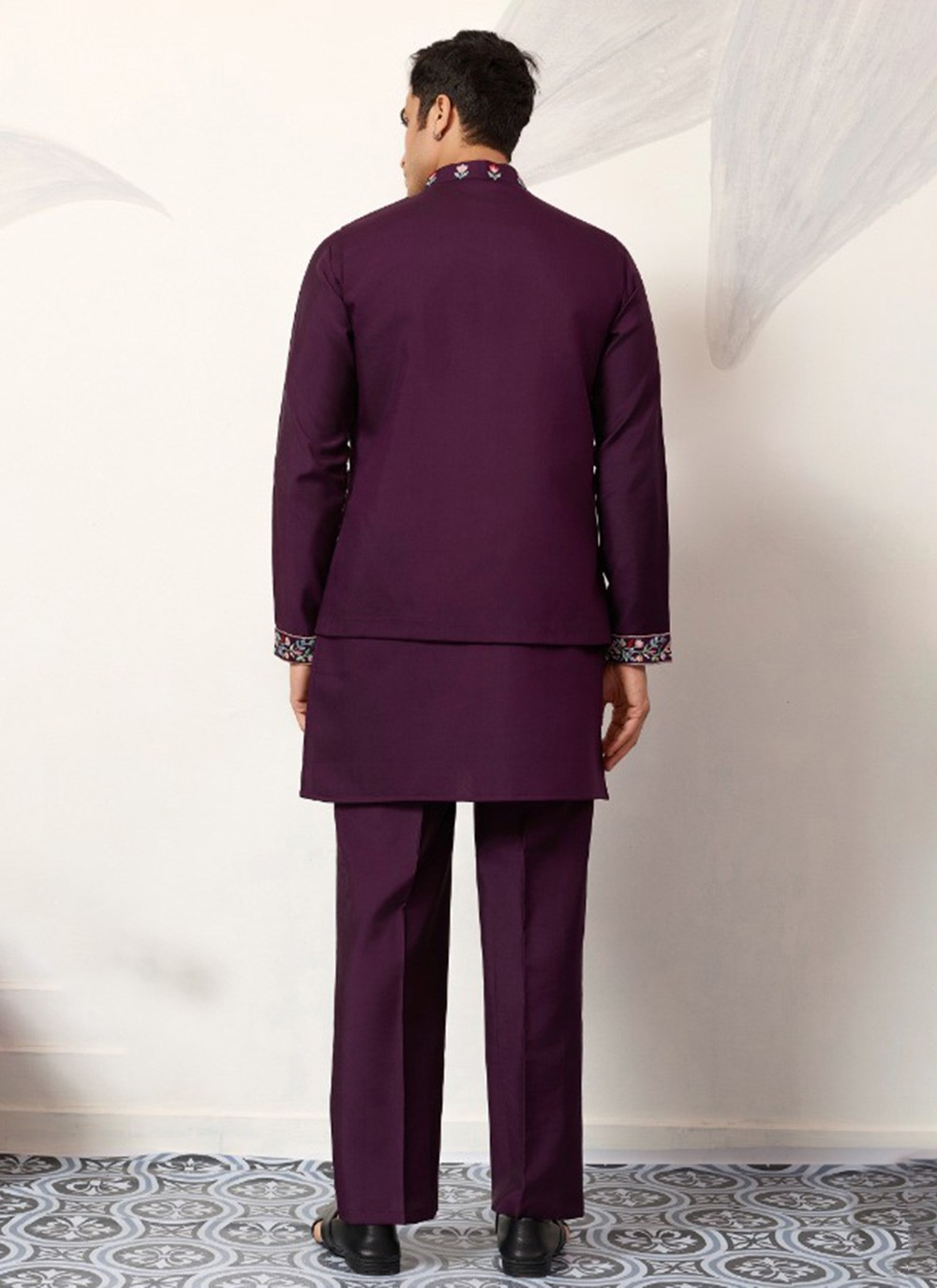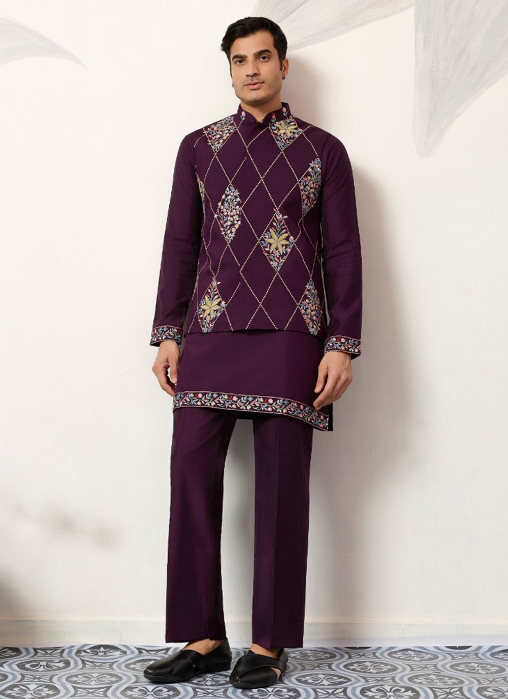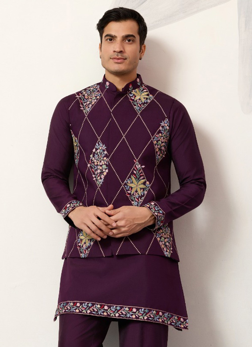 Enhance your ceremonial wardrobe with this beautifully embroidered purple kurta payjama with jacket. The detailed threadwork and shimmering sequins blend seamlessly with the soft art silk fabric for comfort and elegance.