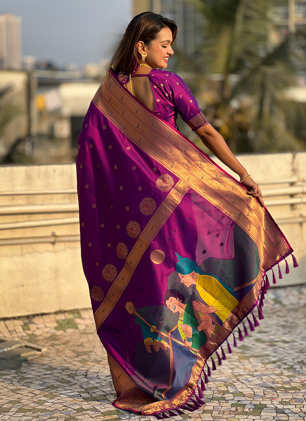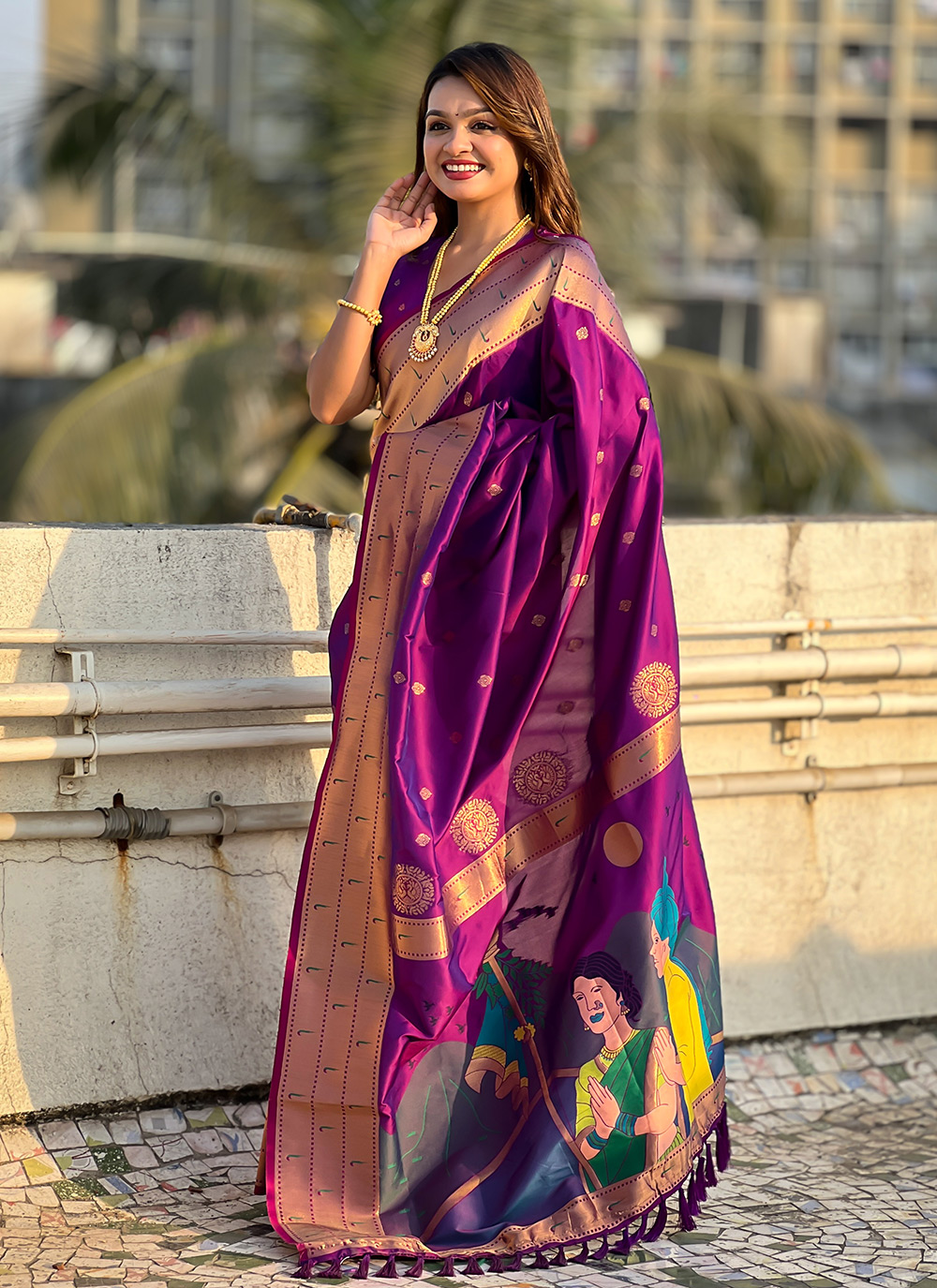 This Purple Weaving Silk Classic Saree, paired with a matching blouse, features intricate weaving for a luxurious, timeless look. Perfect for weddings and special occasions, it combines elegance and comfort in one stunning ensemble.