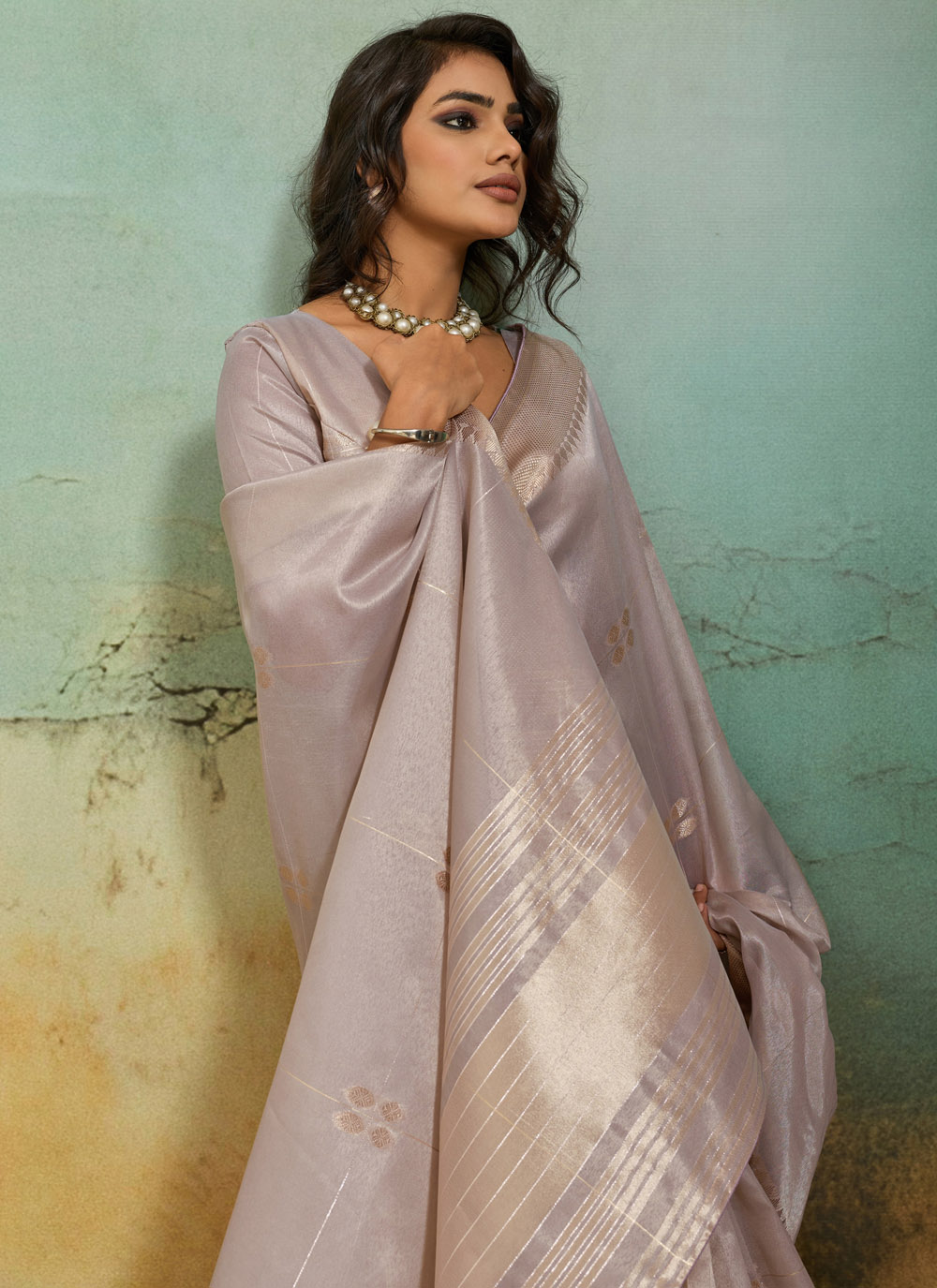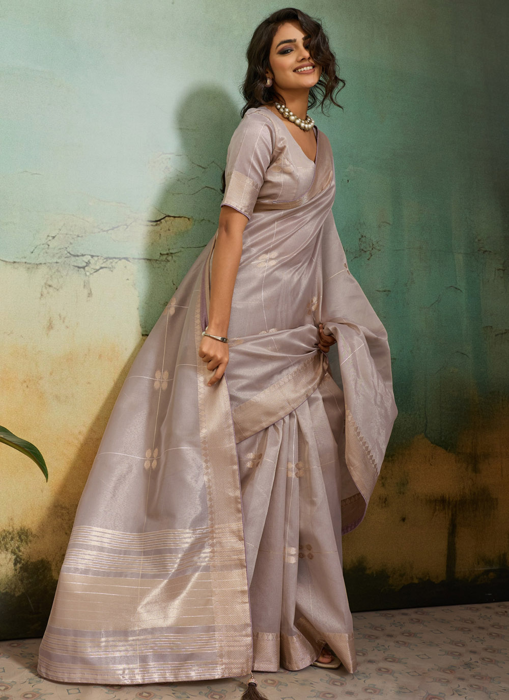 Experience timeless beauty with this purple woven tissue linen saree that offers both elegance and versatility. The fabric’s subtle shine enhances the rich purple shade, while the woven design adds a refined touch. Comes with matching blouse.