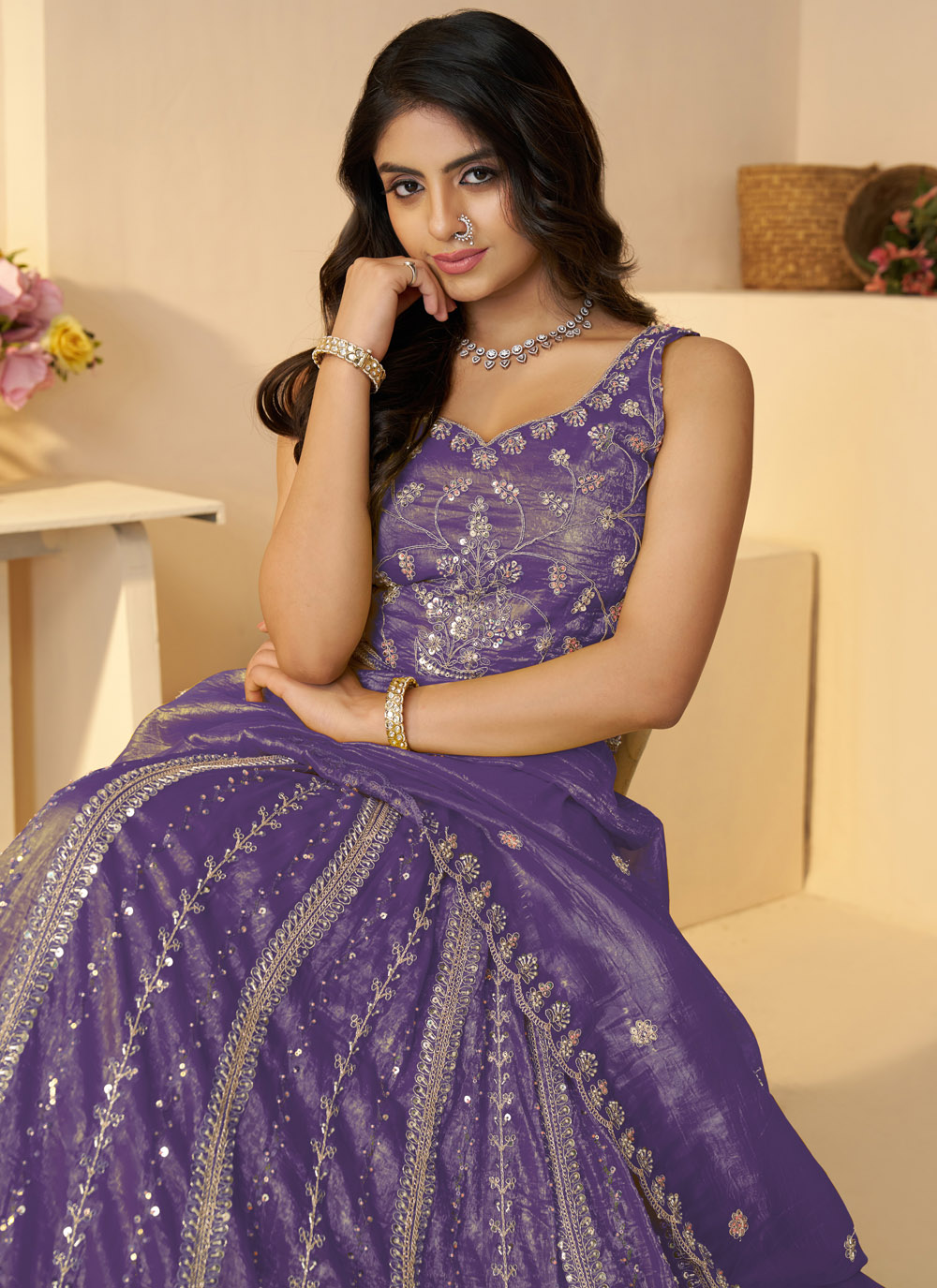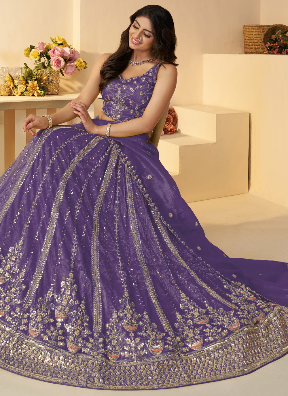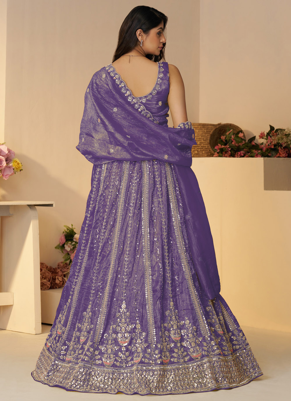 This stunning purple lehenga choli is designed to make you stand out. From the flowy long silhouette to the sparkling Jimmy Chu fabric adorned with sequins and zari, it’s a flawless look for grand occasions like sangeet or receptions. Comes with matching choli and dupatta.
